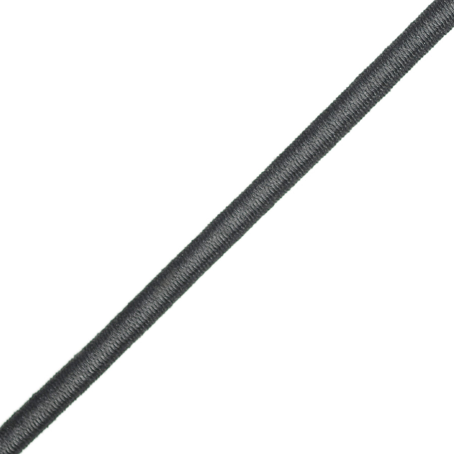 Round braided elastic in black. Suitable for millinery, mask making. Also known as shot elastic, cord elastic and hat elastic.