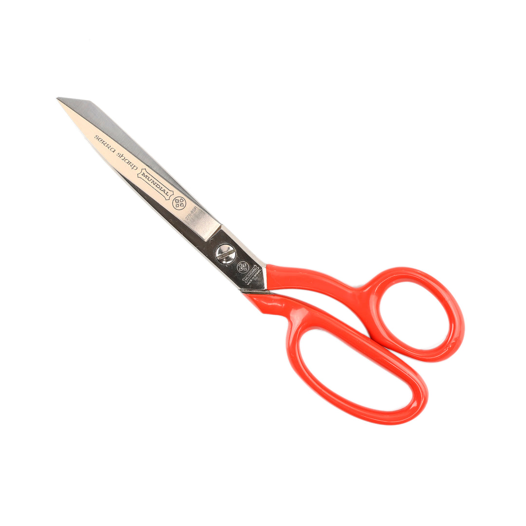 Mundial forged sewing shears with red handle. Manufactured from carbon steel with nickel-plated blades.