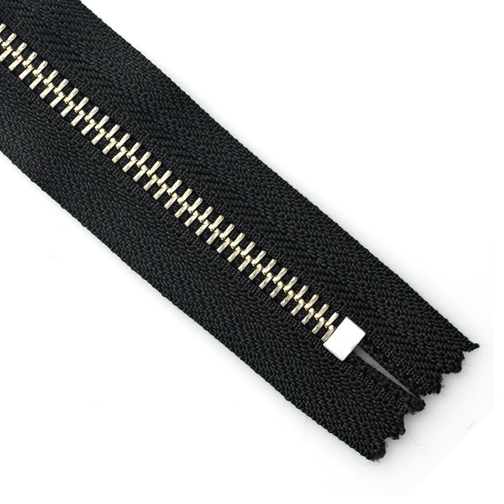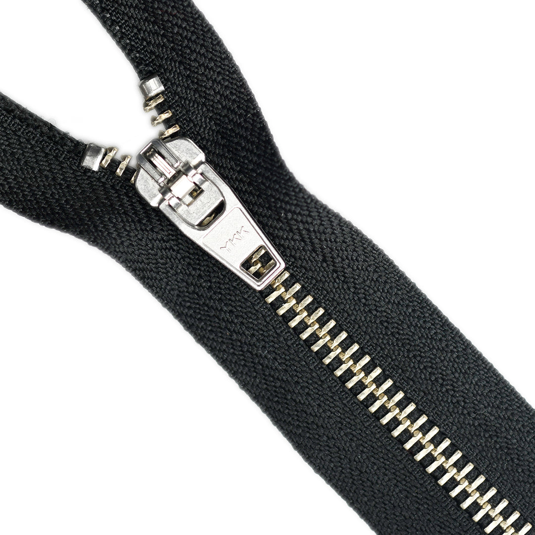 Medium gauge YKK jean zip designed specifically for use on denim jeans and jackets with elements in nickel. Hard-wearing jean zips that are suited to workwear, outdoor-wear, and heavy-duty fabrics.
