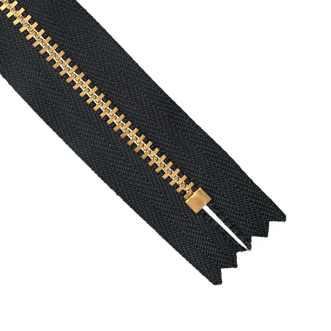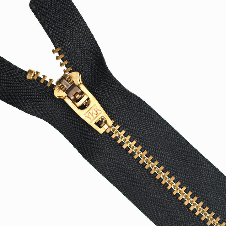 Lightweight gauge YKK jean zip designed for use on denim jeans and jackets with elements in gold.