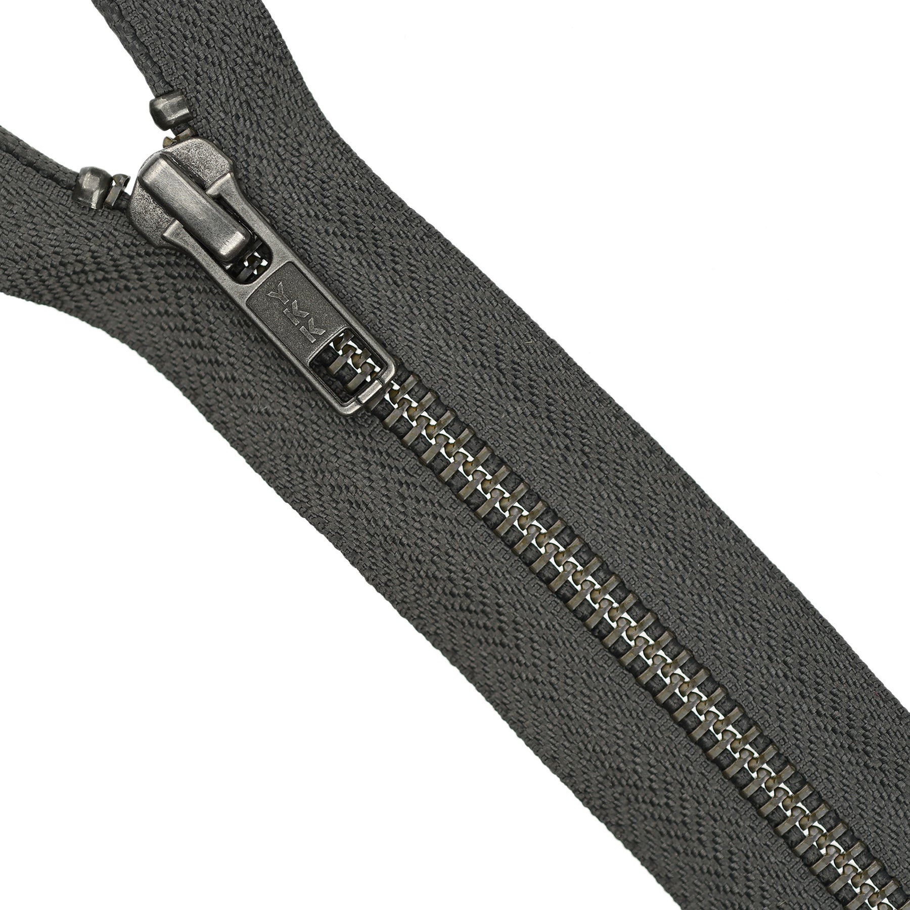 Medium gauge, open-end YKK No.5 metal zip with vintage-look Antique Nickel elements. Suitable for garments such as jackets, hoodies and knitwear.