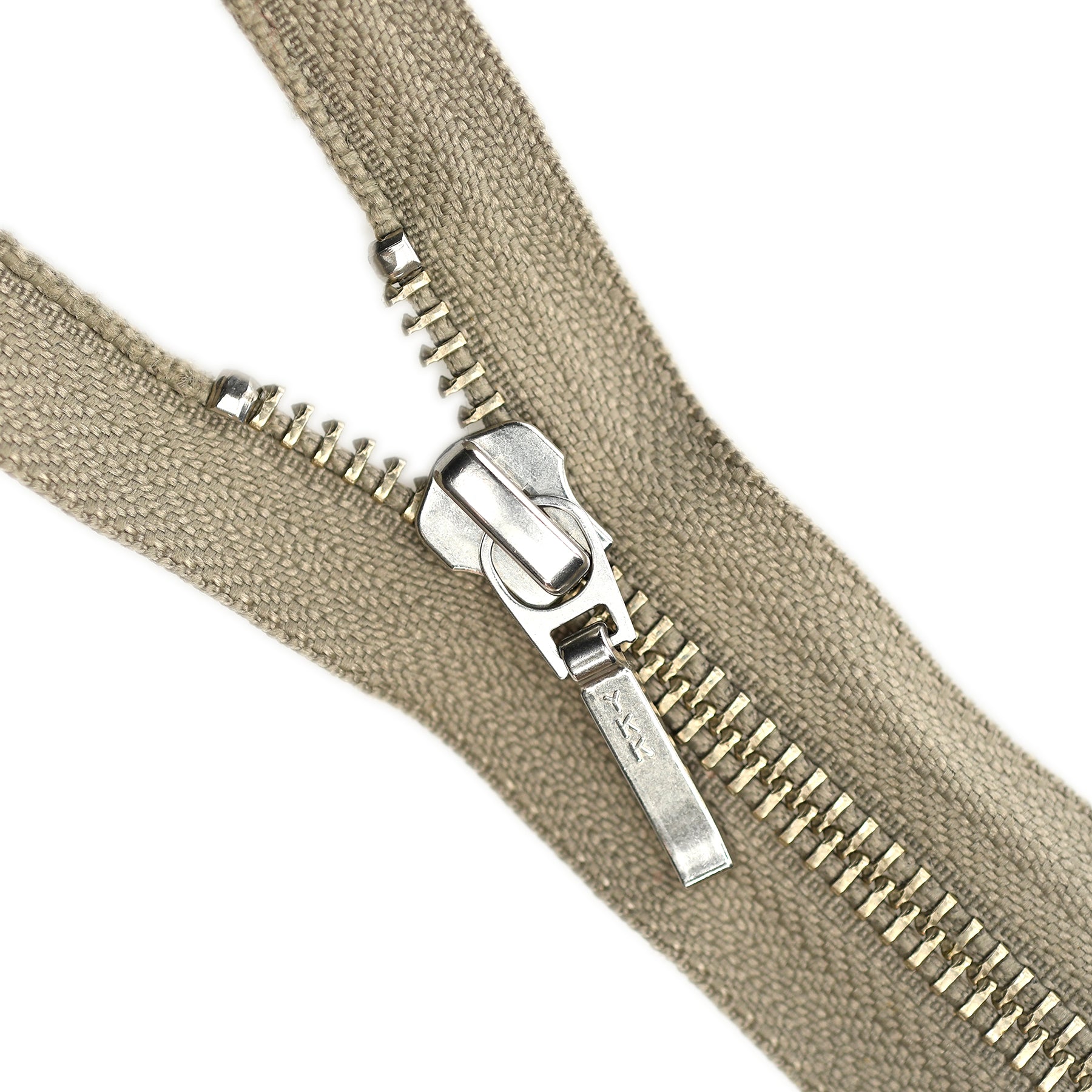 YKK medium gauge, open-end metal zips in traditional nickel finish with distinctive board-pull slider. Suitable for applications including garments, jackets, knitwear and accessories.