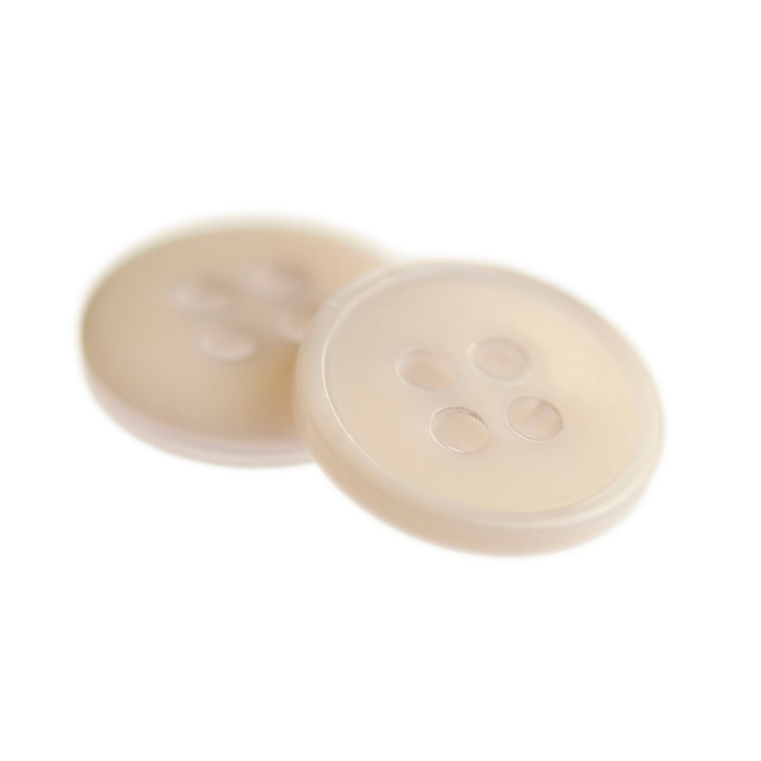 Four-hole button with flat, narrow rim on front outer edge. Features a gloss, pearlised finish and solid colour on reverse side.
