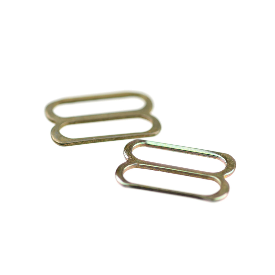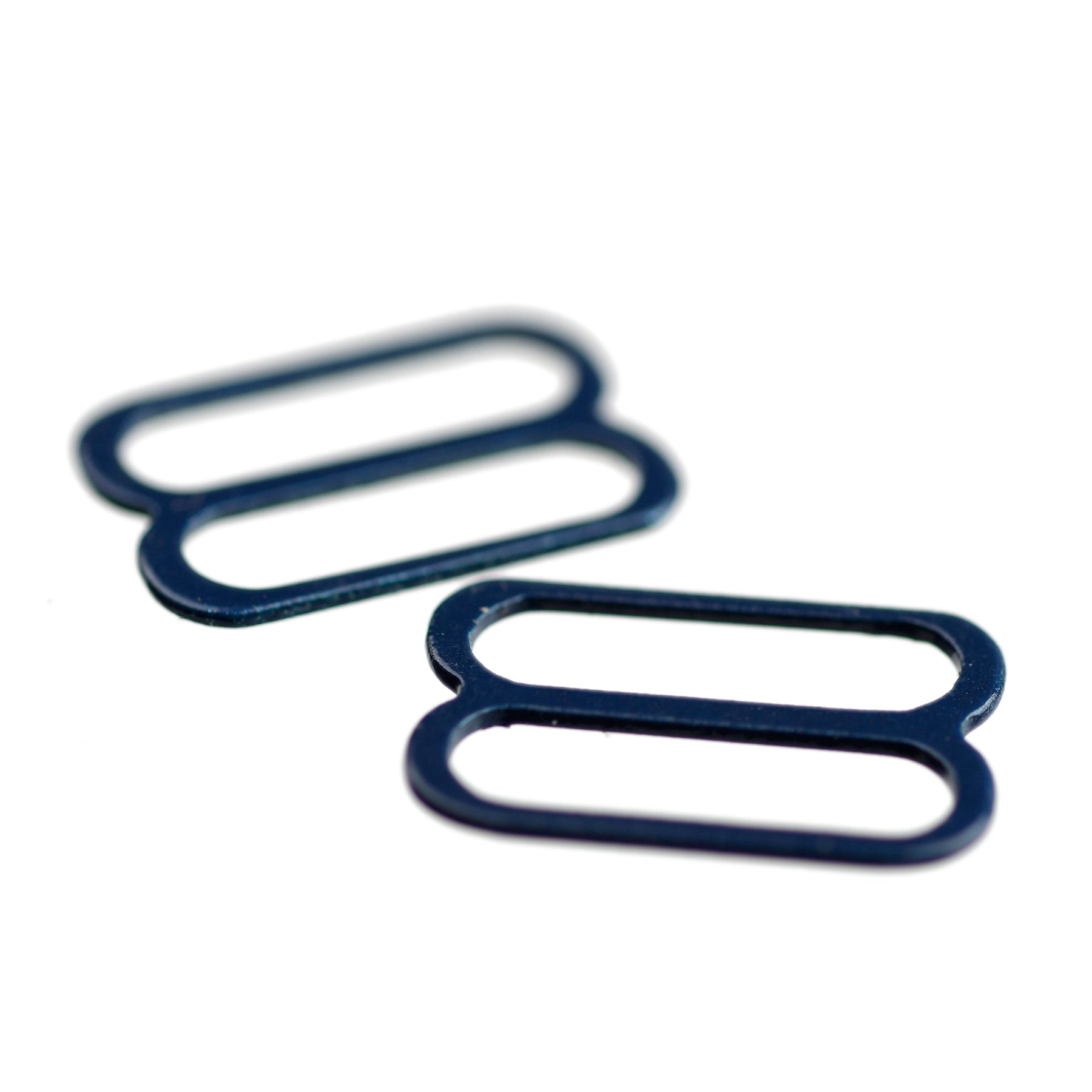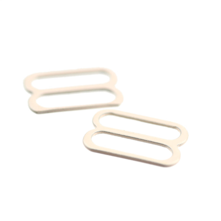 Hard-wearing coated steel fine, rounded slide for strap adjustments on garments and lingerie.