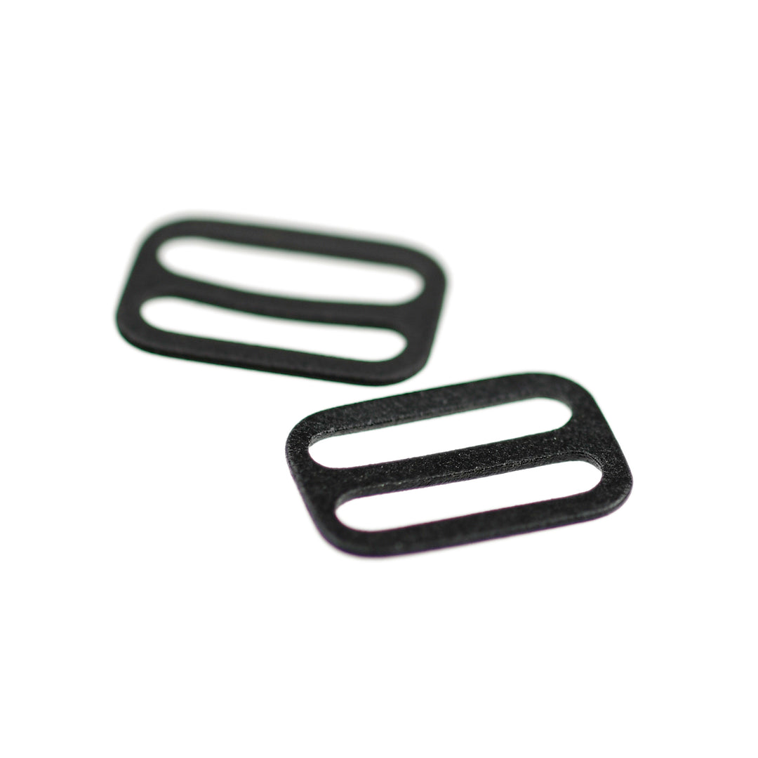 Hard-wearing coated steel slide for strap adjustments on garments and lingerie.