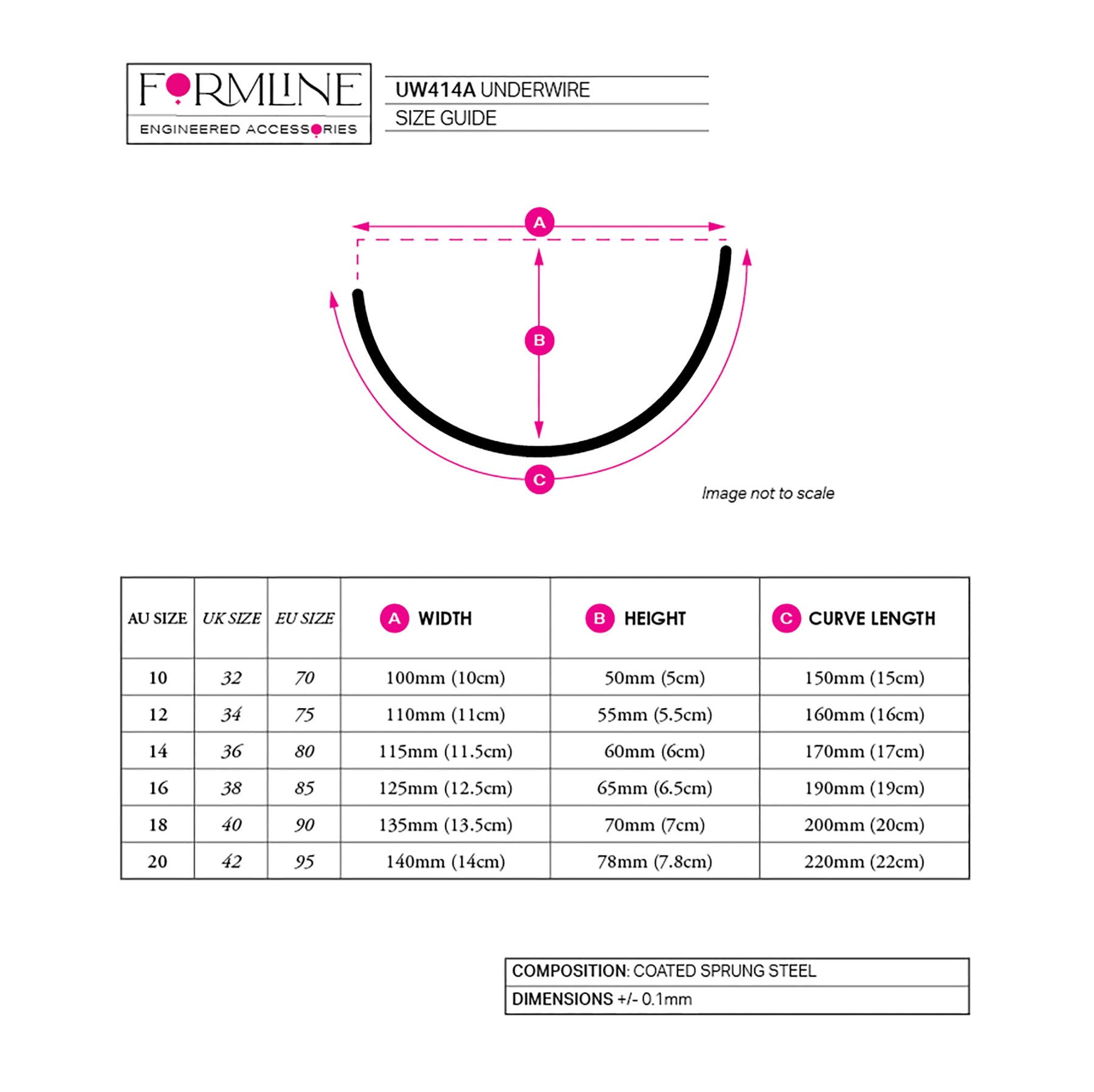 Style UW414A coated, sprung-steel underwires provide support for classic low-cut styles. Consistent depth and gentle asymmetry offer balanced comfort for smaller cup volumes. Recommended for use in styles that require discreet and subtle structural support.