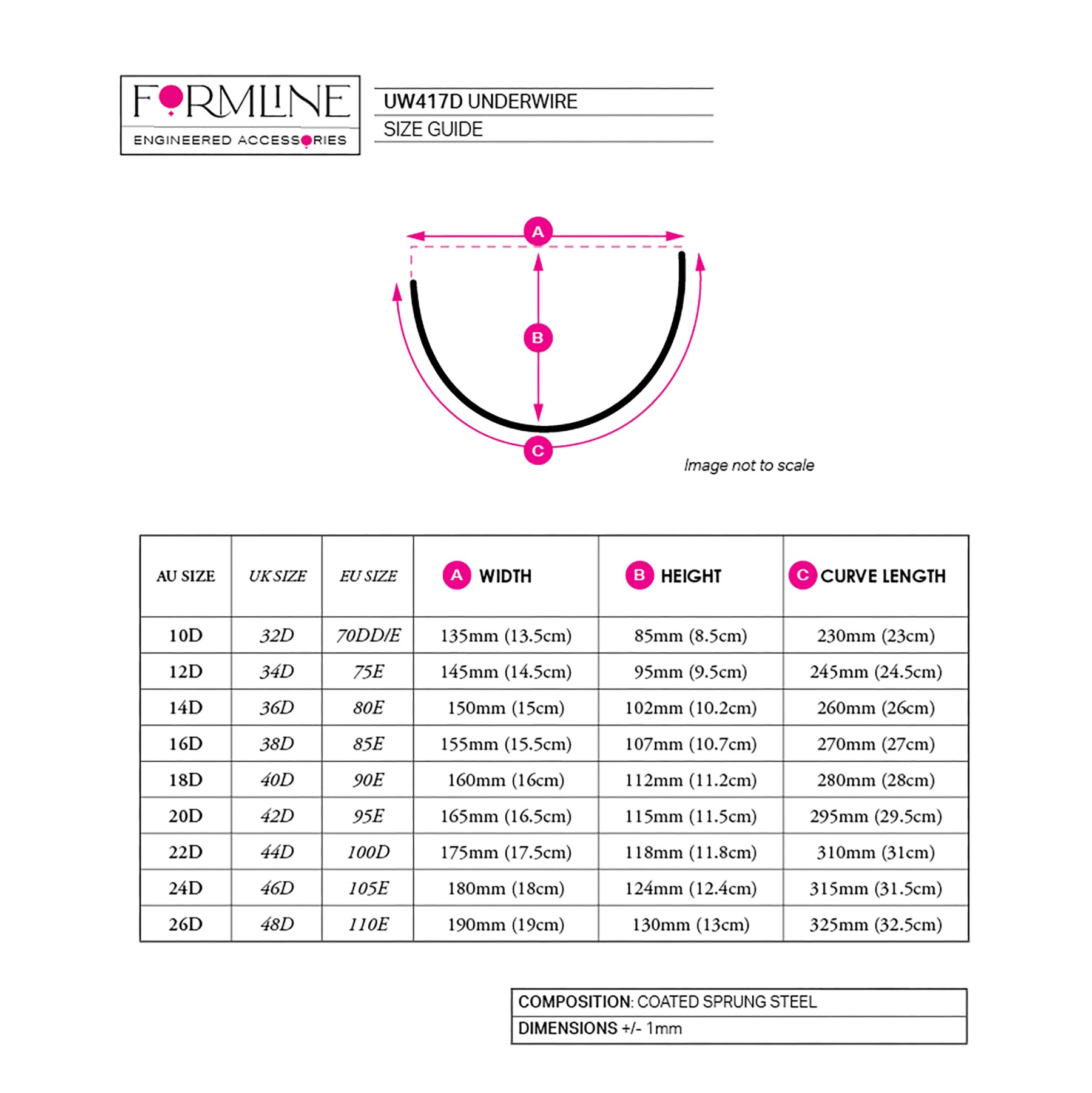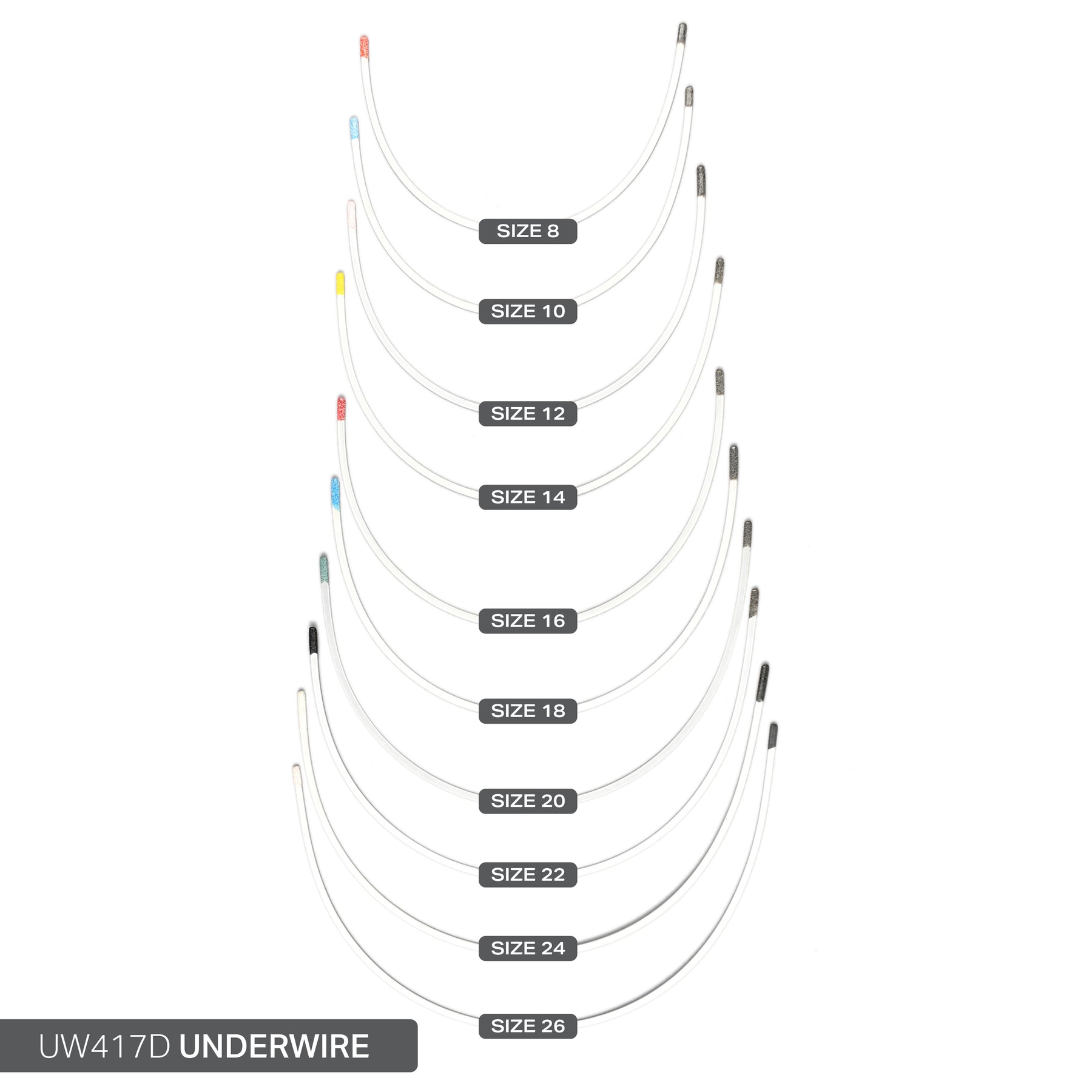 UW417D coated, sprung-steel underwires feature deep profiles and strategic asymmetry designed for fuller bust applications. The comprehensive size range from 8D to 26D provides solutions for both standard and extended sizing requirements in garments, lingerie and swimwear.