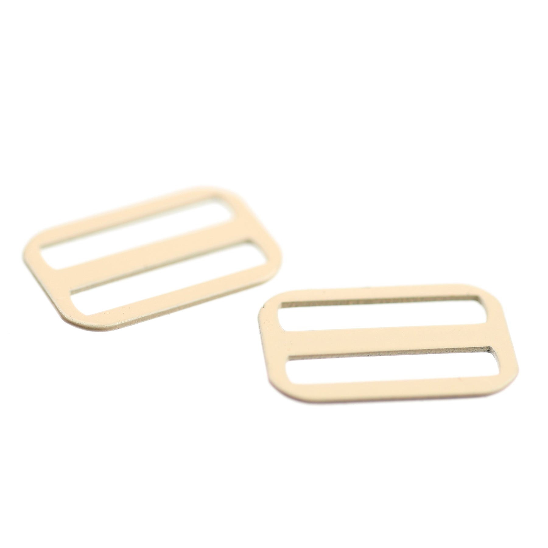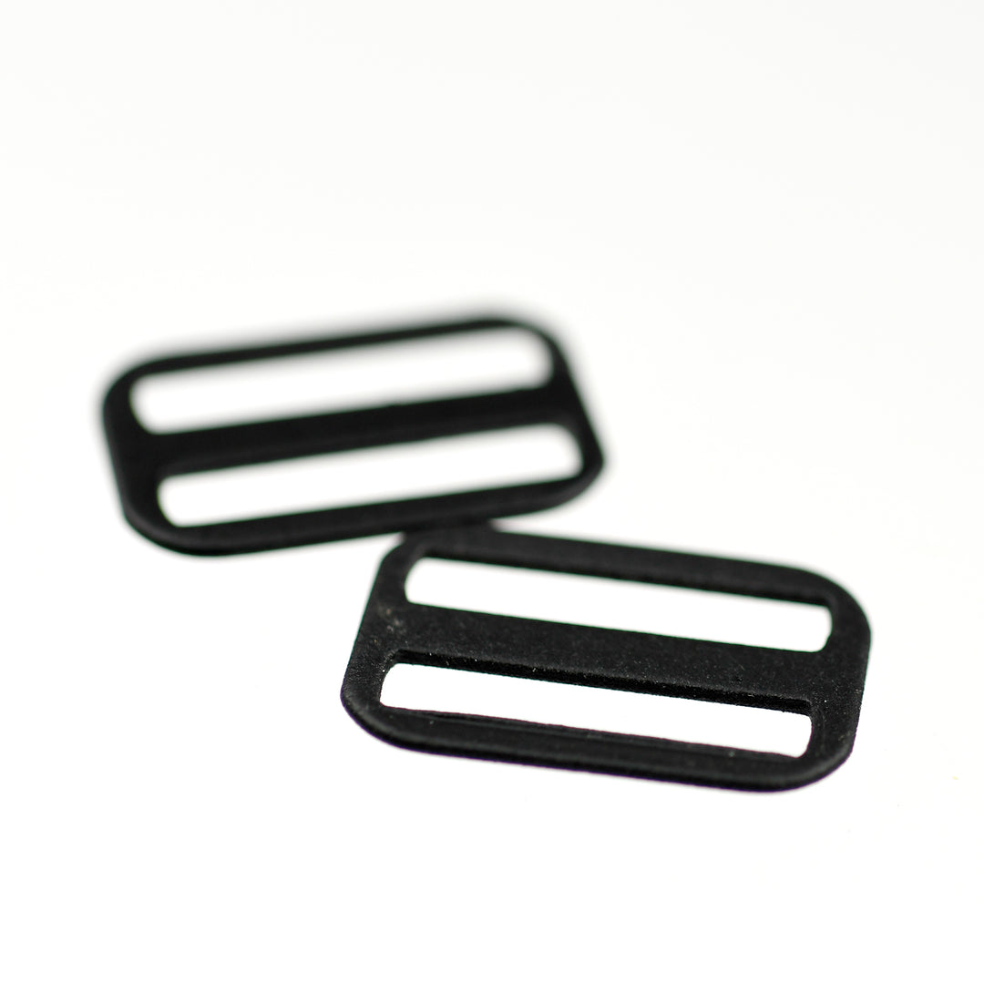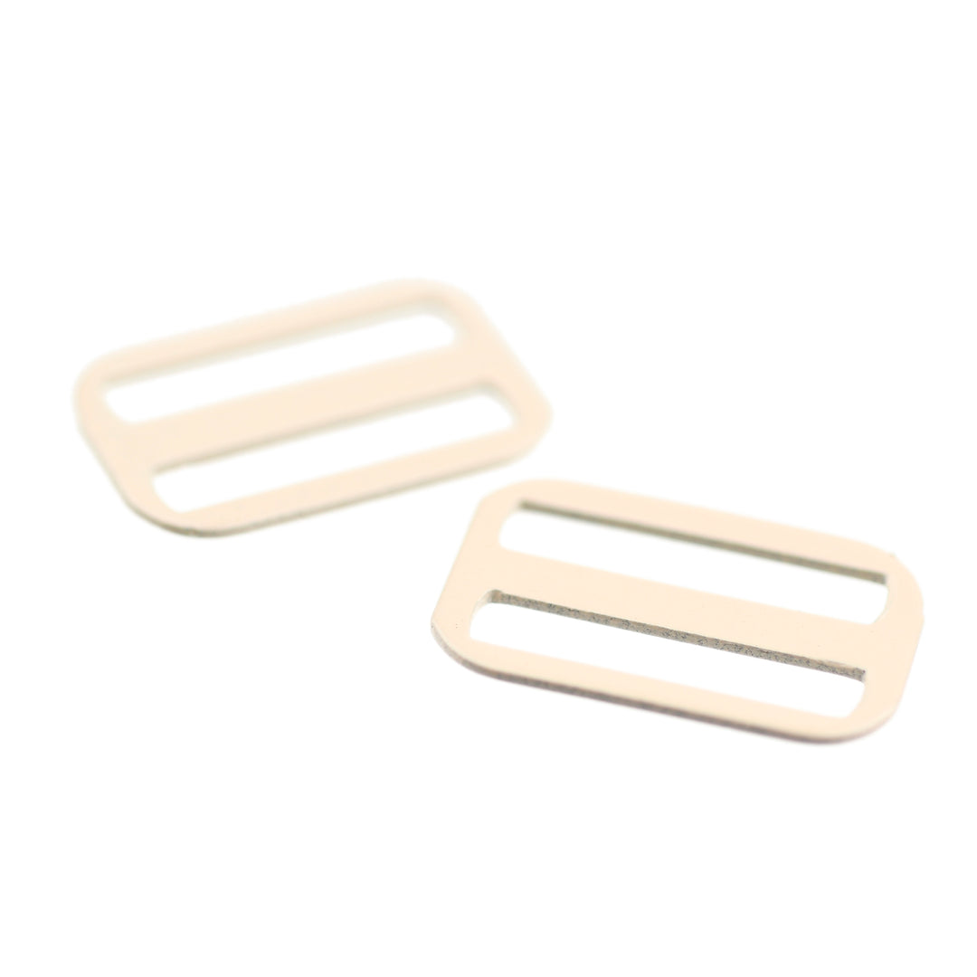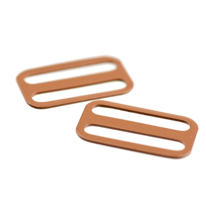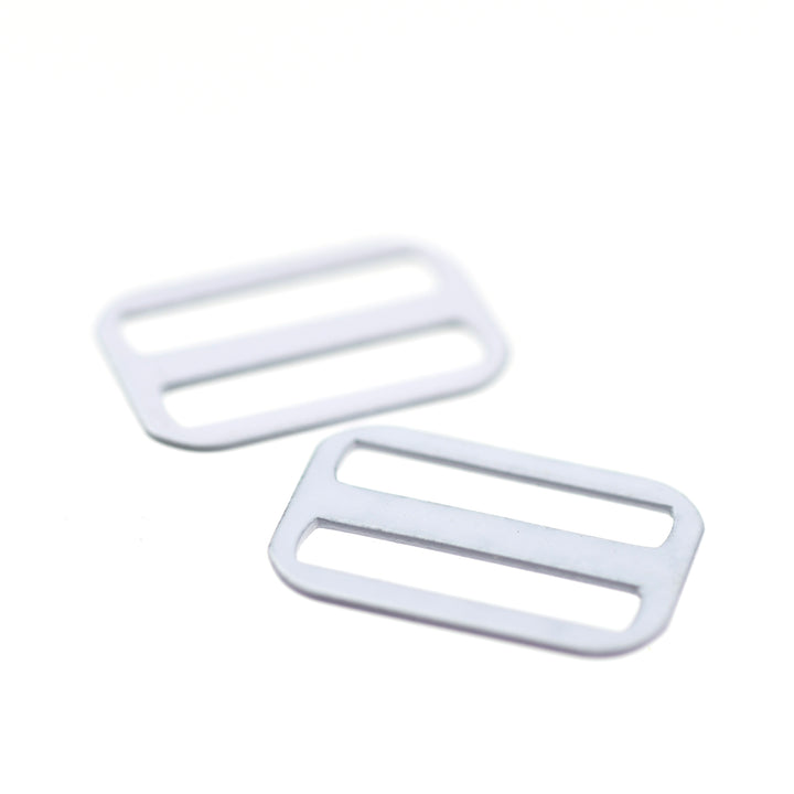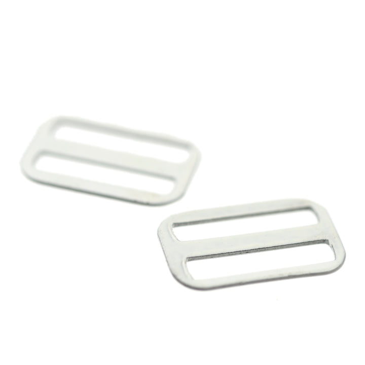 Hard-wearing coated steel slide for strap adjustments on garments and lingerie.