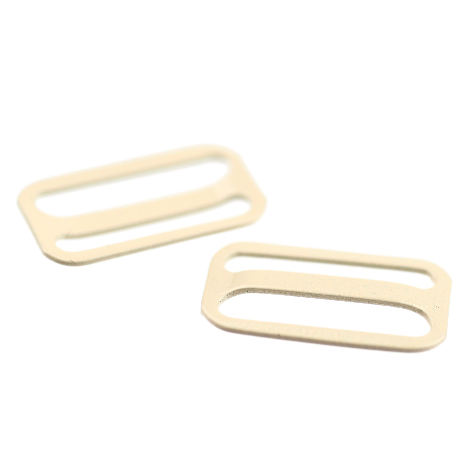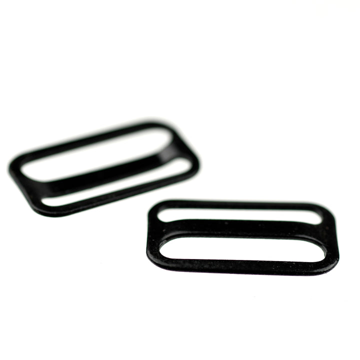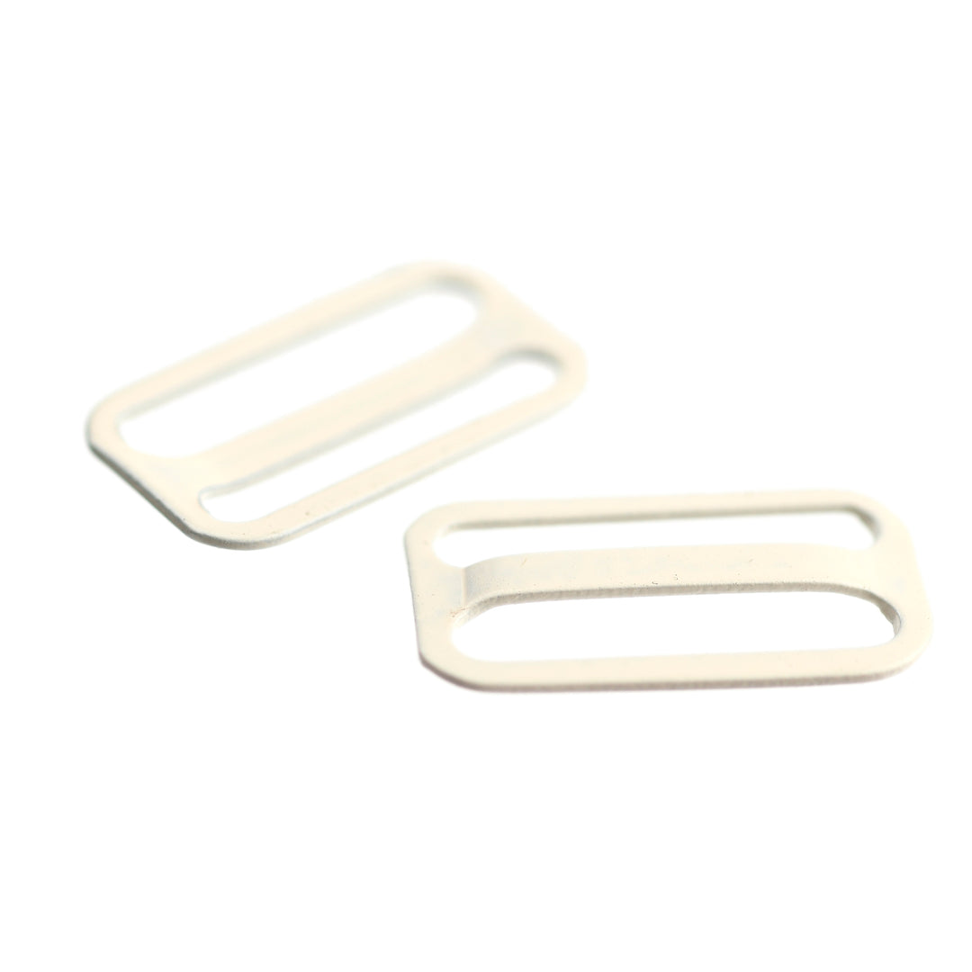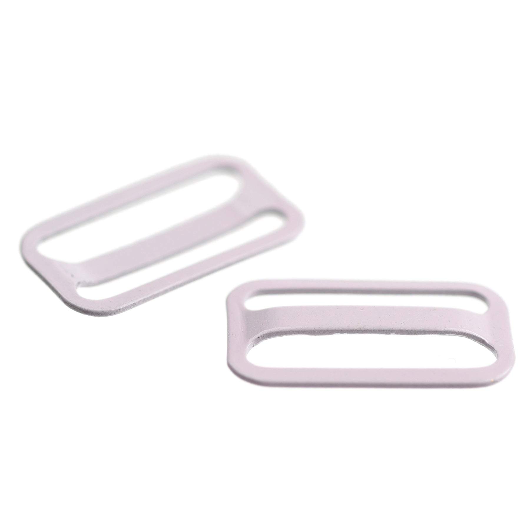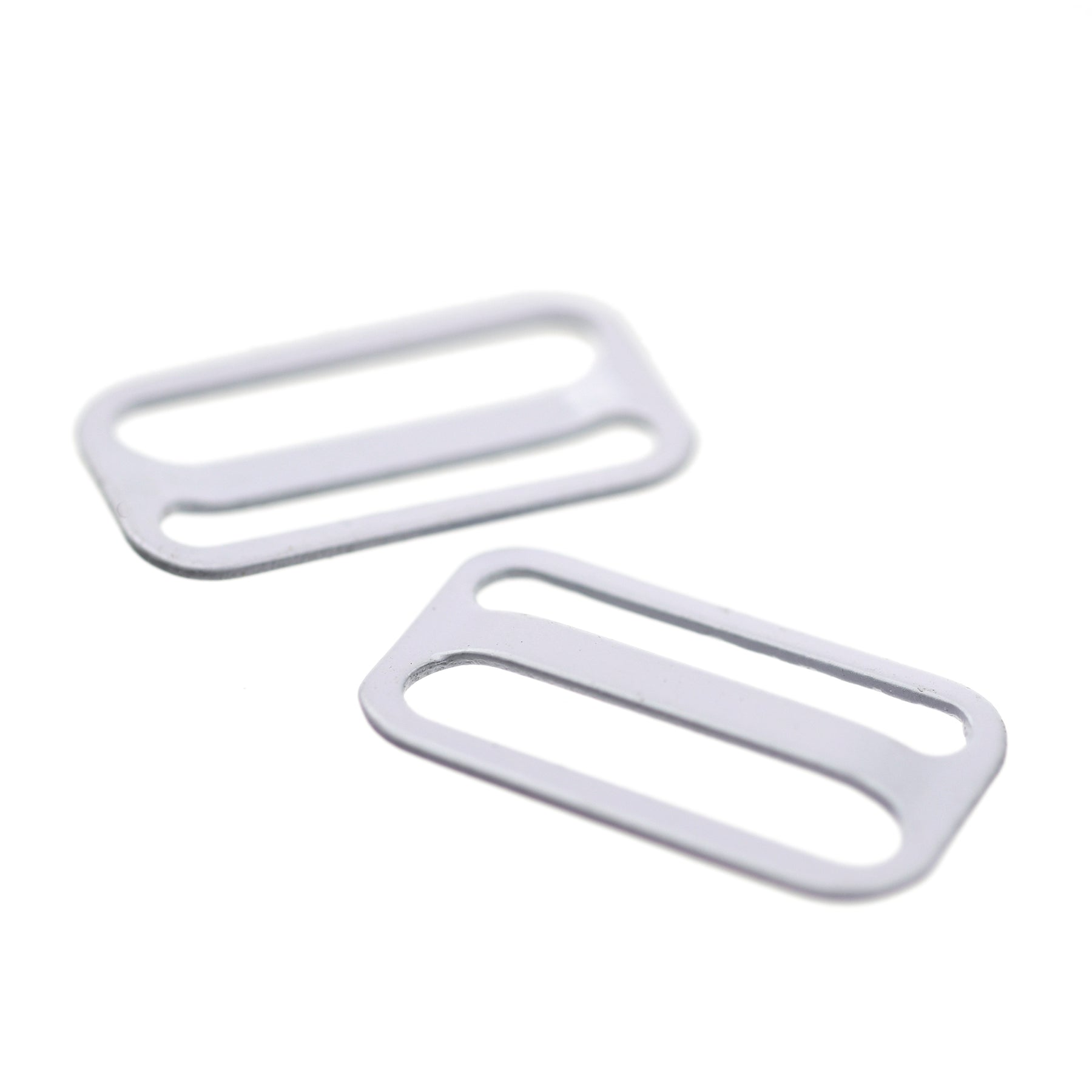 Metal slide for straps on garments including lingerie and swimwear. Coated steel fitting is exceptionally strong with excellent hold. Central raised bar is suitable for thick elastic or fabric straps.
