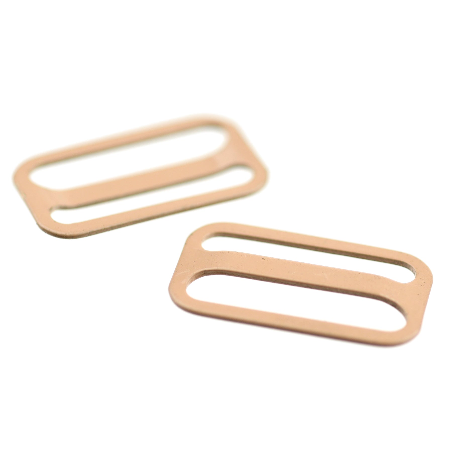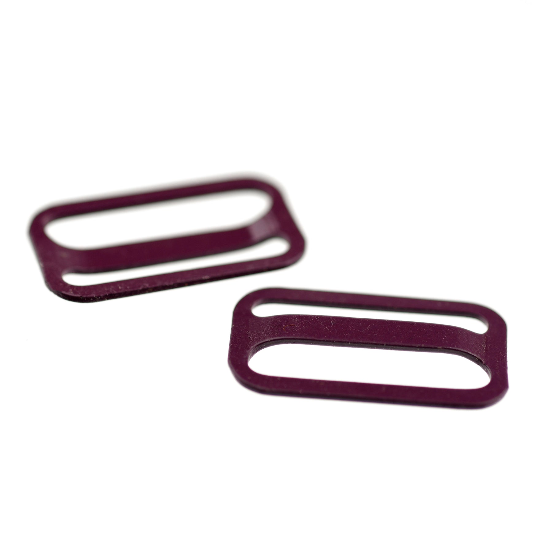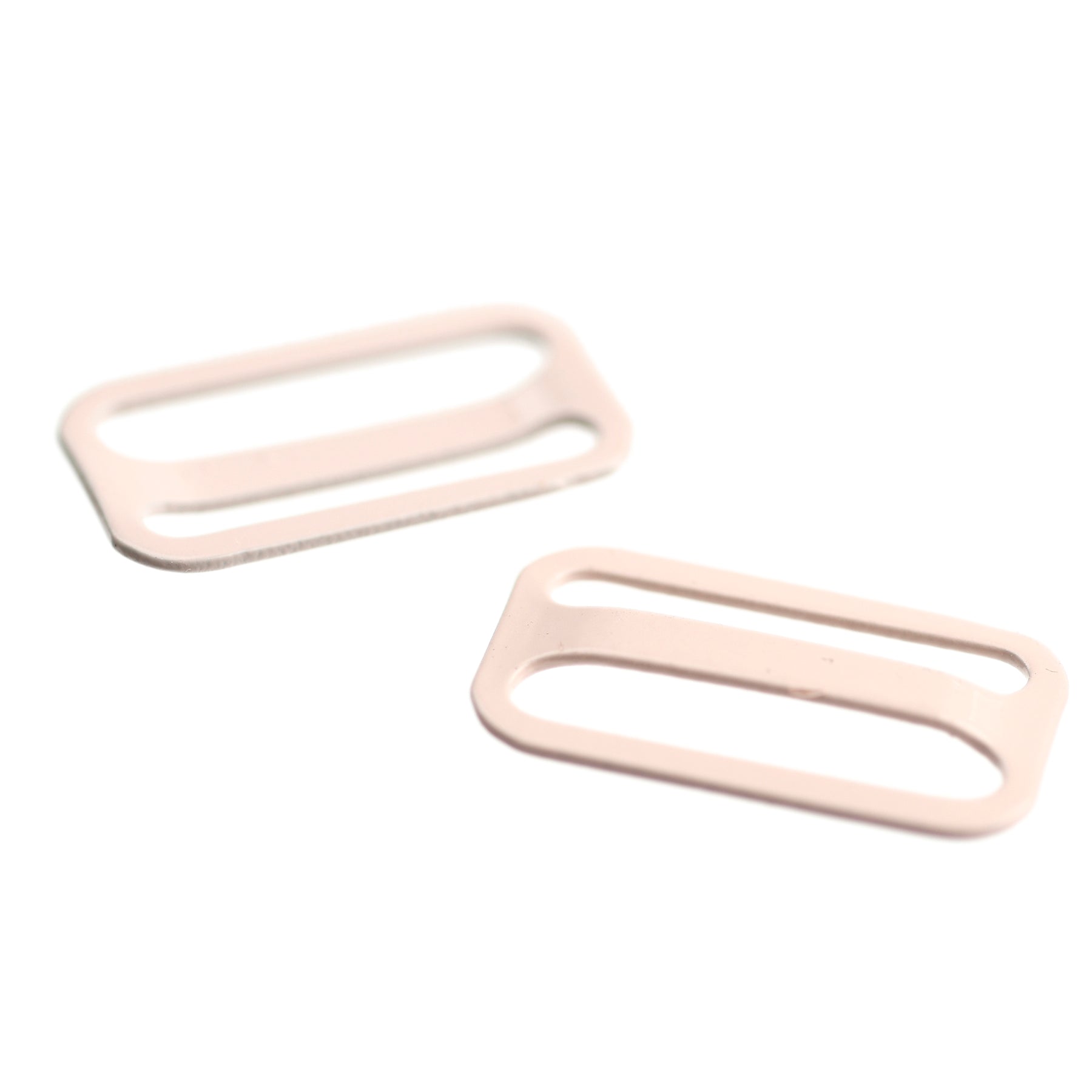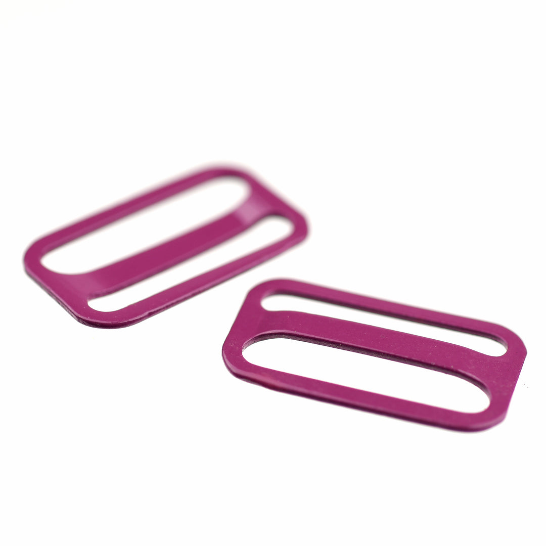 Metal slide for straps on garments including lingerie and swimwear. Coated steel fitting is exceptionally strong with excellent hold. Central raised bar is suitable for thick elastic or fabric straps.