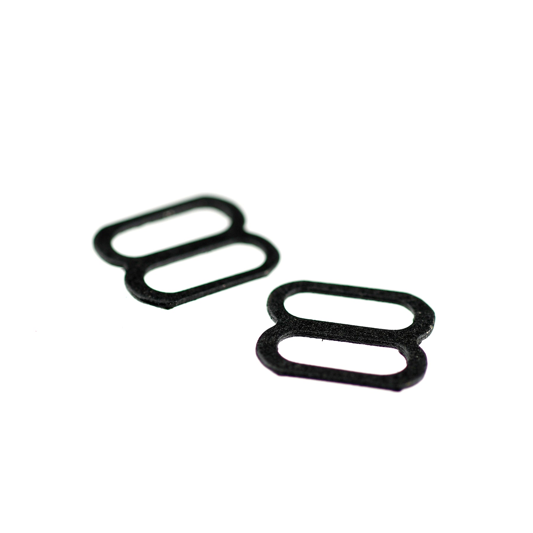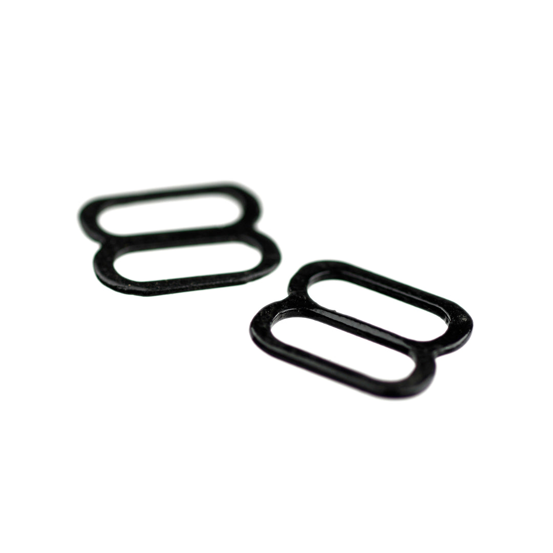 Hard-wearing coated steel fine, rounded slide for strap adjustments on garments and lingerie.