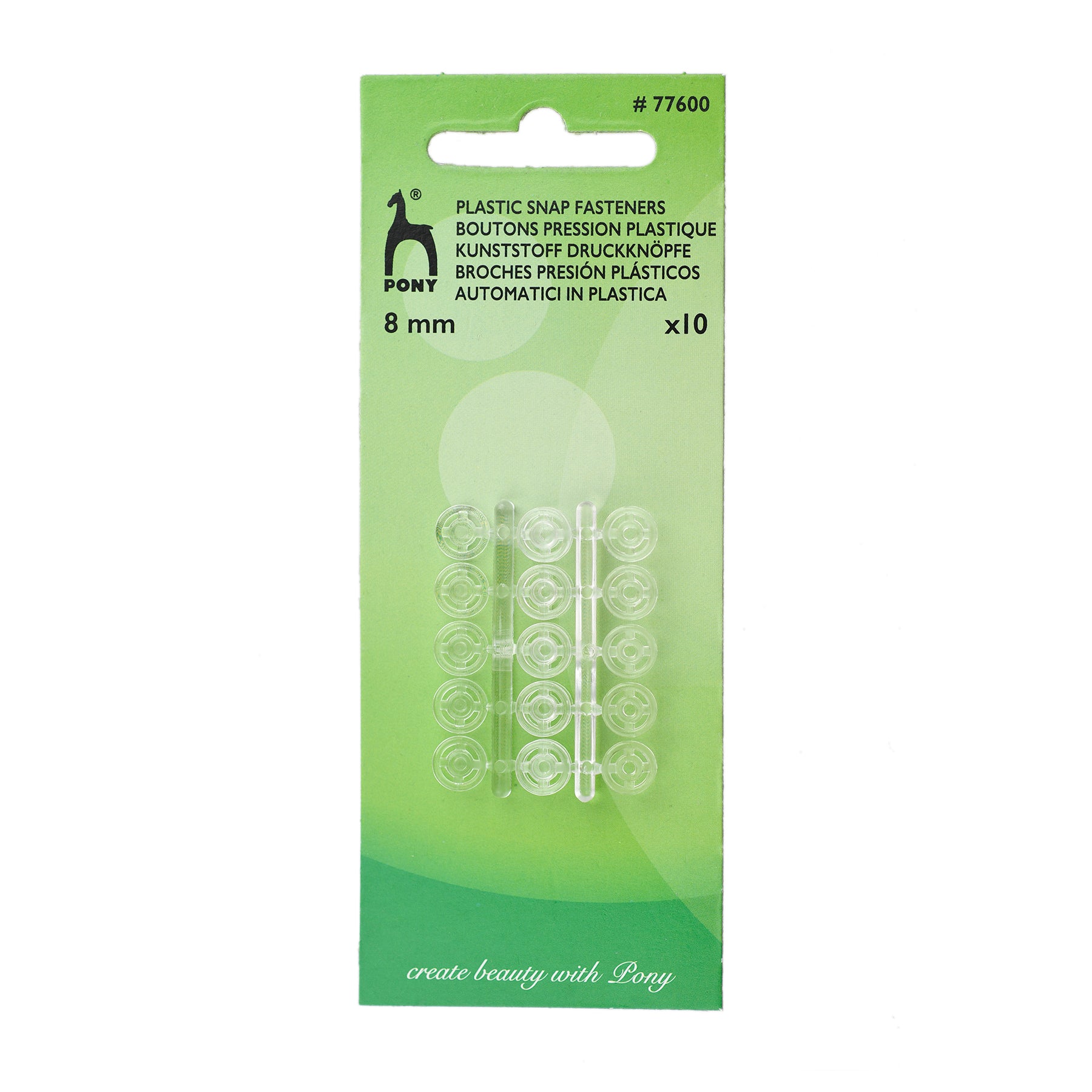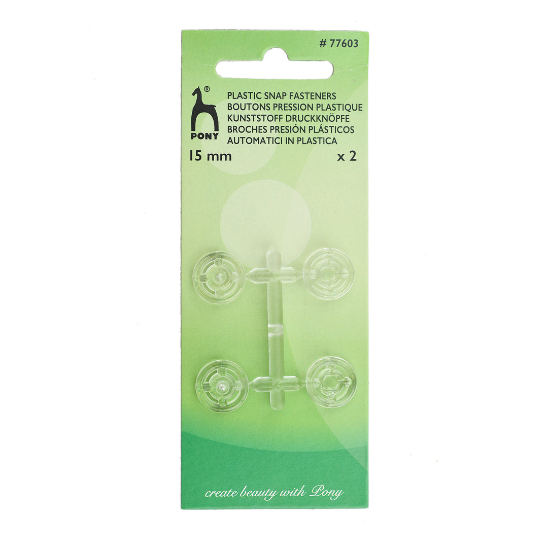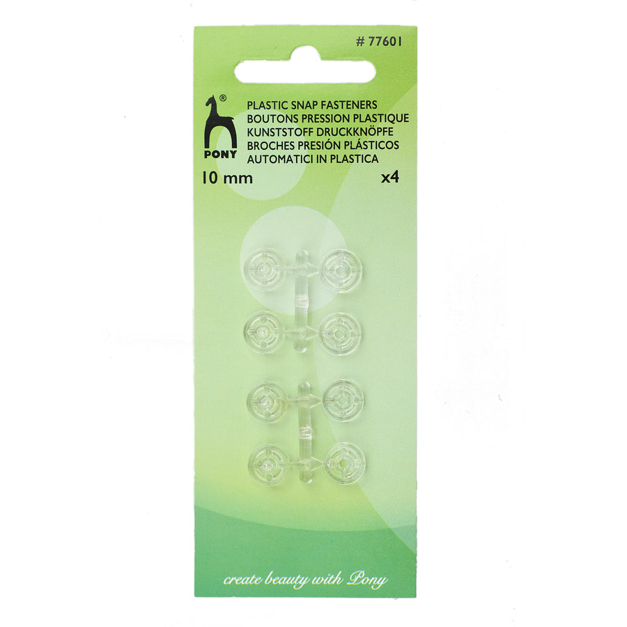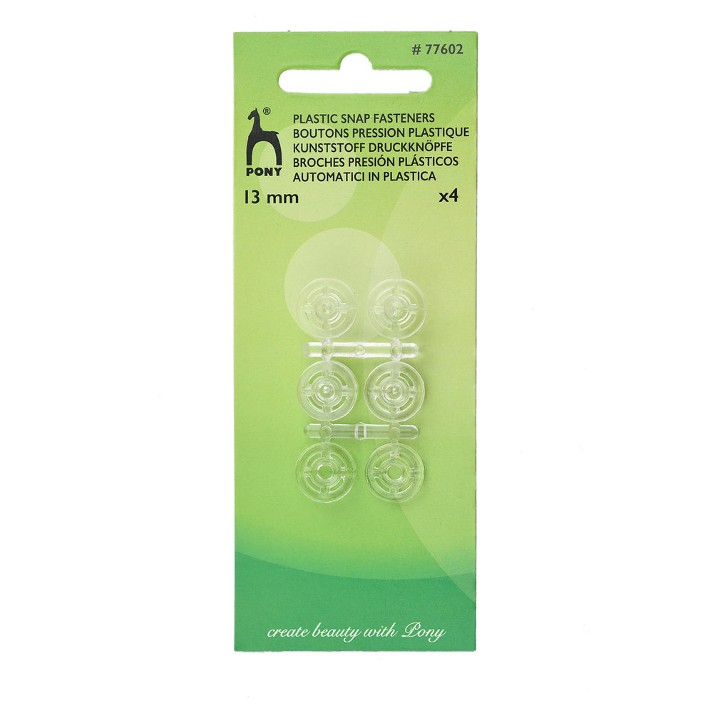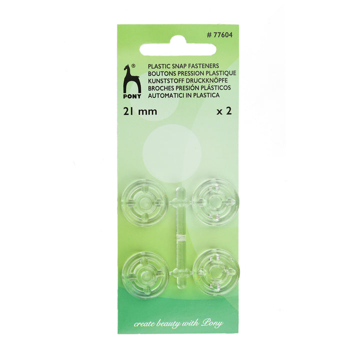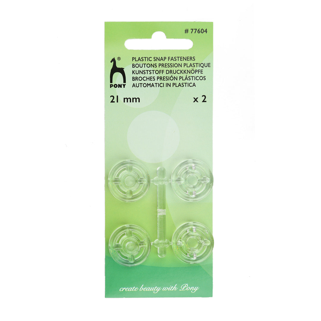 Sew-on snap fasteners in clear, firm polycarbonate.