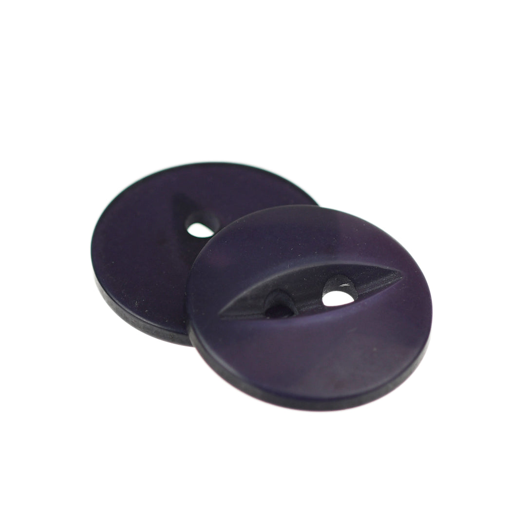 Raised dome shaped button with a small semi-circular indentation in the centre to form the 'fish-eye' or 'cat-eye' shape. Popular button style suitable for many applications.