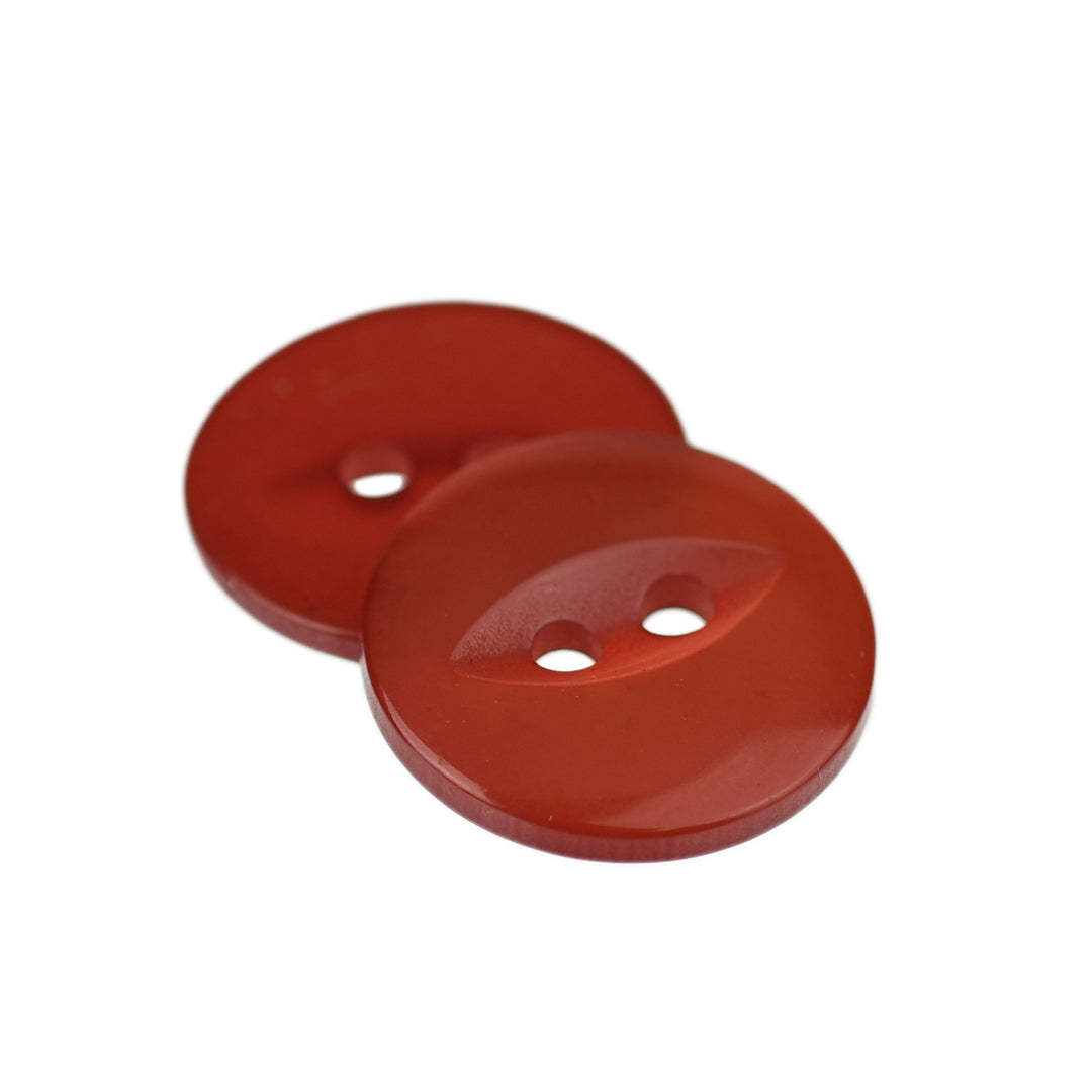 Raised dome shaped button with a small semi-circular indentation in the centre to form the 'fish-eye' or 'cat-eye' shape. Popular button style suitable for many applications.