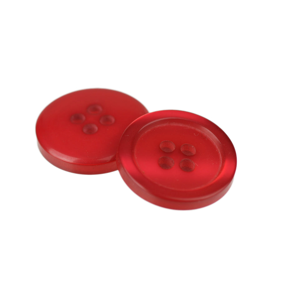 Glossy, pearl-finish four-hole button with flattened rim on front face. Solid matte colour on a slightly domed back.