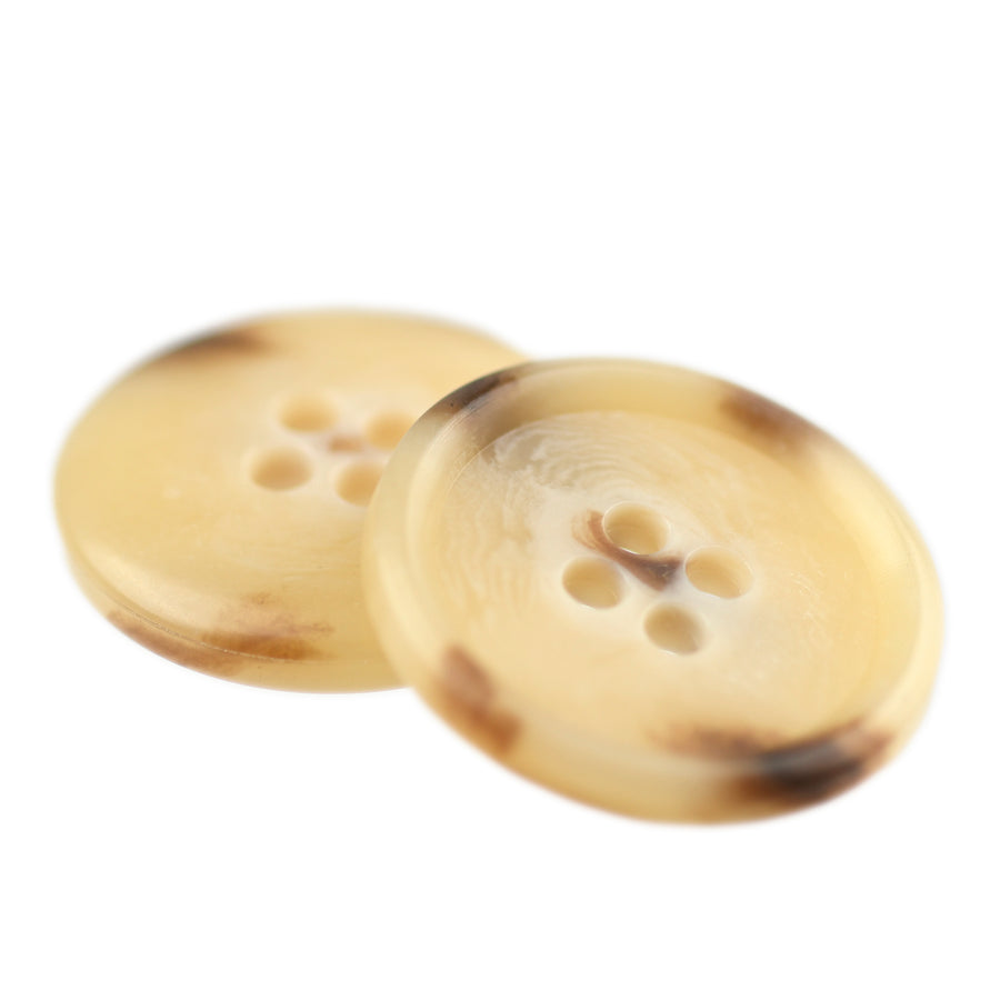 Traditional four-hole coat/ jacket button with front rim and slightly domed back. Opaque, satin finish with marbling.