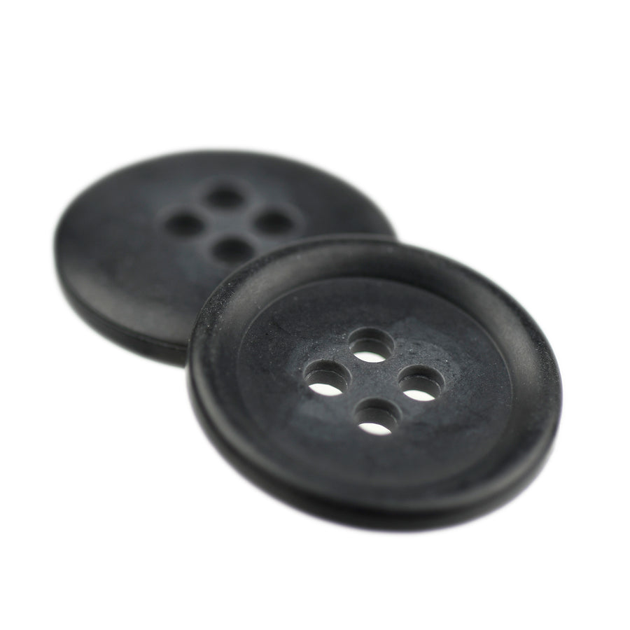 Traditional four-hole coat/ jacket button with very slightly domed back. Opaque, matte finish with medium rim and some minimal marbling.