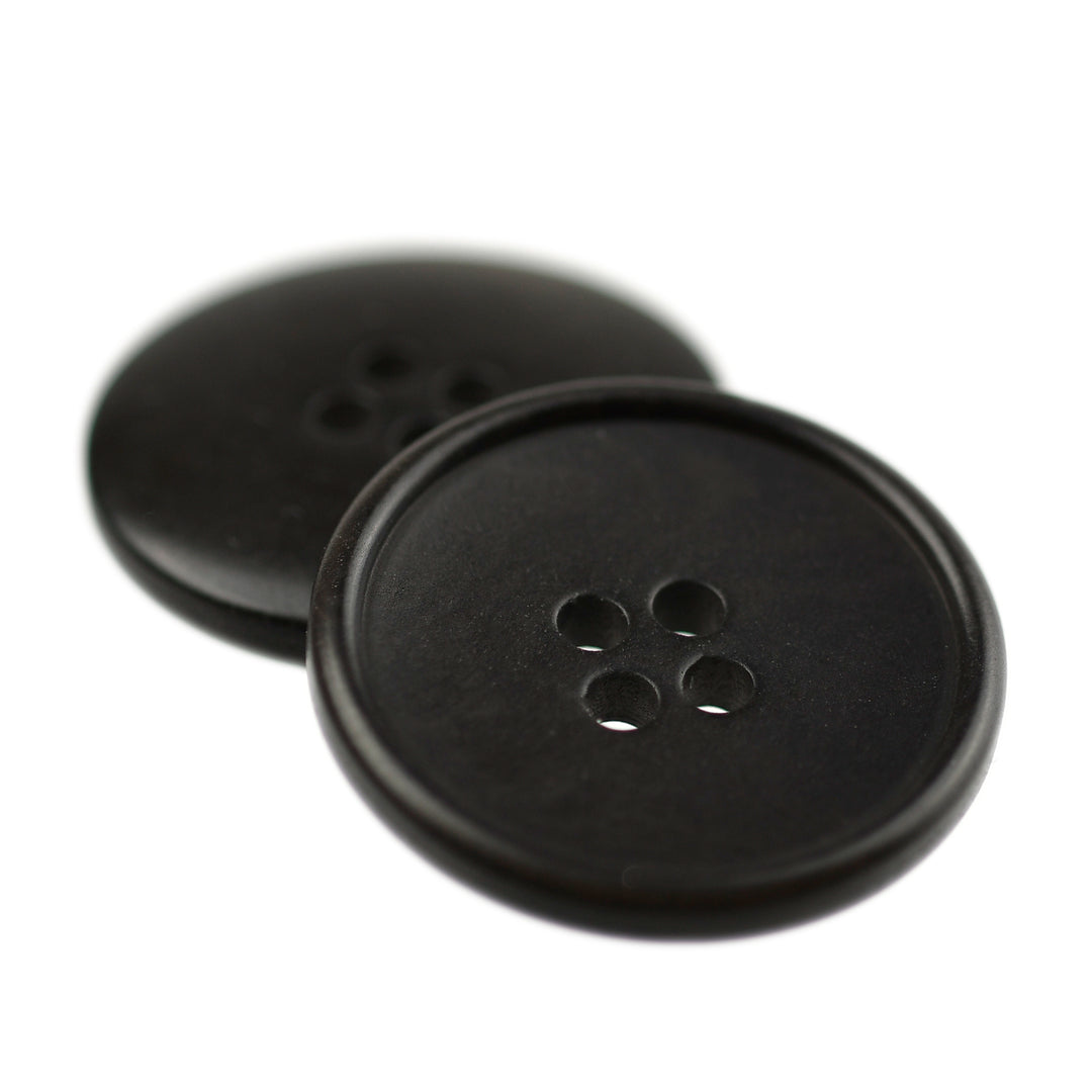 Four-hole button with narrow rim on front face and slightly domed back. Satin, very dark brown finish.