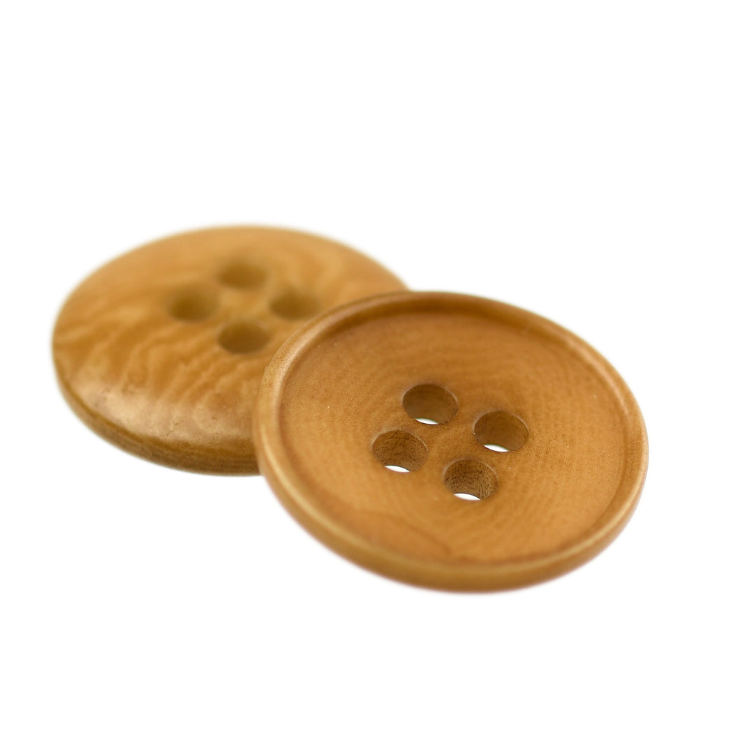 Four-hole button with satin finish and subtle woodgrain pattern. Outer rim on front face and slightly domed back.