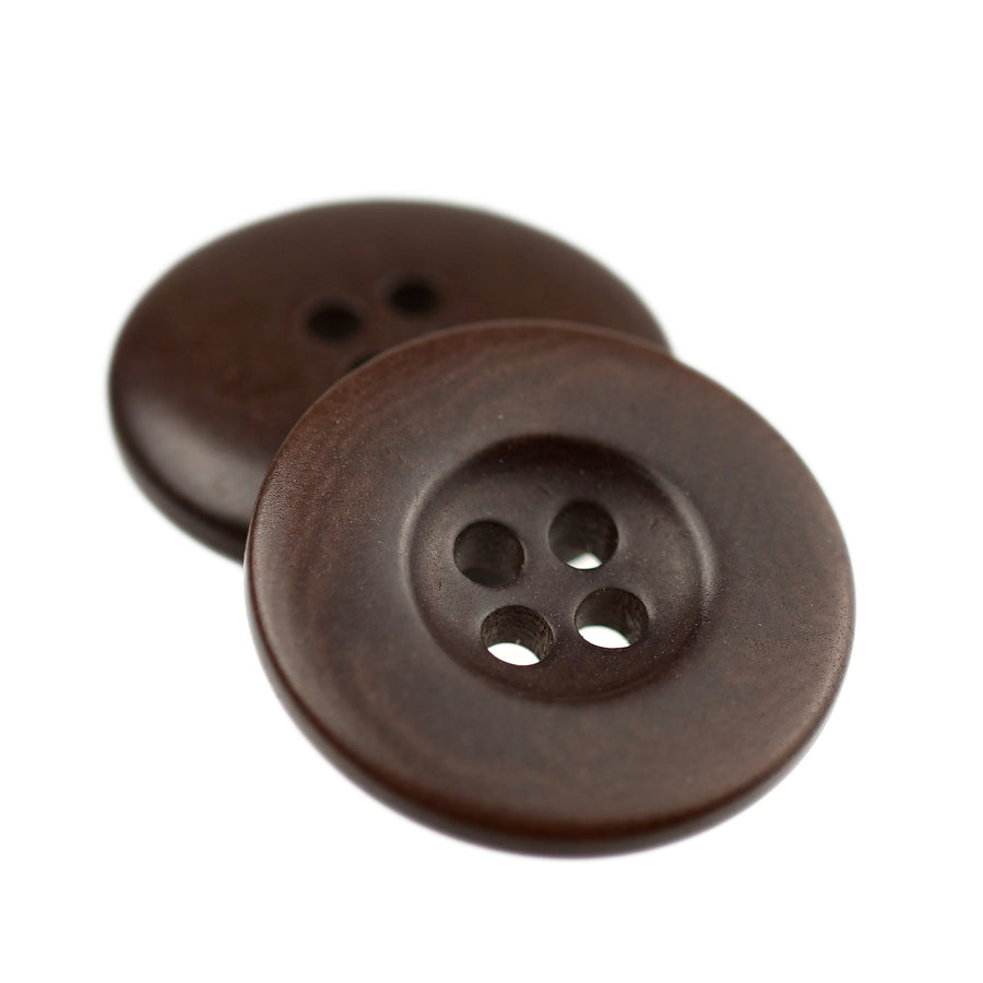 Four-hole button with satin finish and subtle imitation woodgrain pattern. Wide, flat rim with recessed thread holes and flat reverse side.