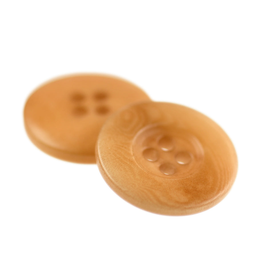 Four-hole button with satin finish and subtle imitation woodgrain pattern. Wide, flat rim with recessed thread holes and flat reverse side.