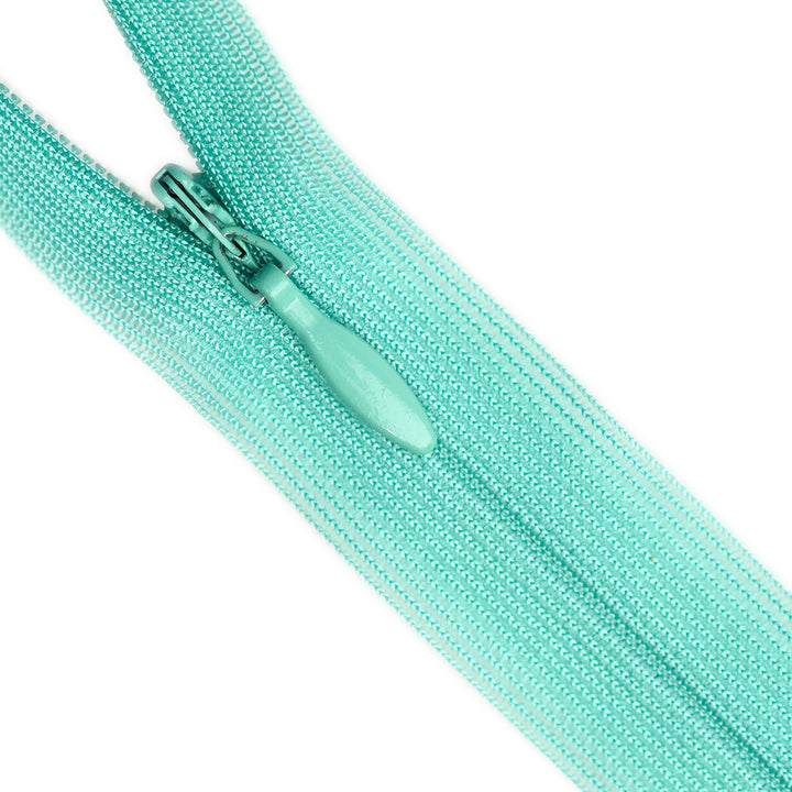 Invisible zip with lightweight mesh tape suitable for skirts, dresses, pants, soft furnishings and other applications where an unobtrusive zip is required. Discreet zip that fits into the seam with only the slim, elongated teardrop slider visible.