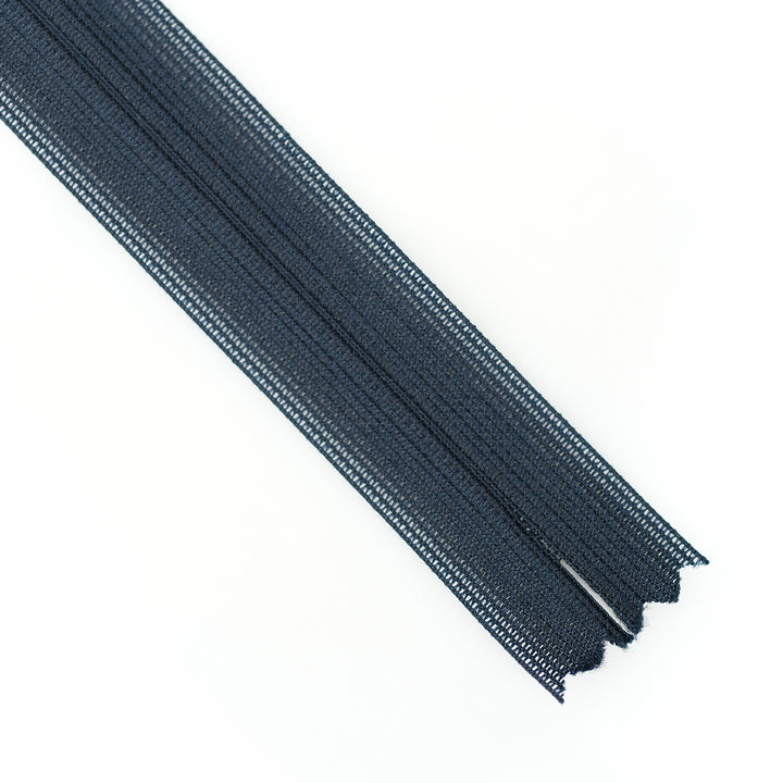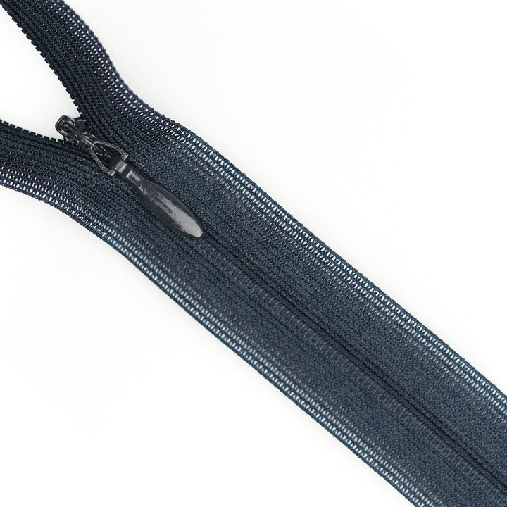 Invisible zip with lightweight mesh tape suitable for skirts, dresses, pants, soft furnishings and other applications where an unobtrusive zip is required. Discreet zip that fits into the seam with only the slim, elongated teardrop slider visible.
