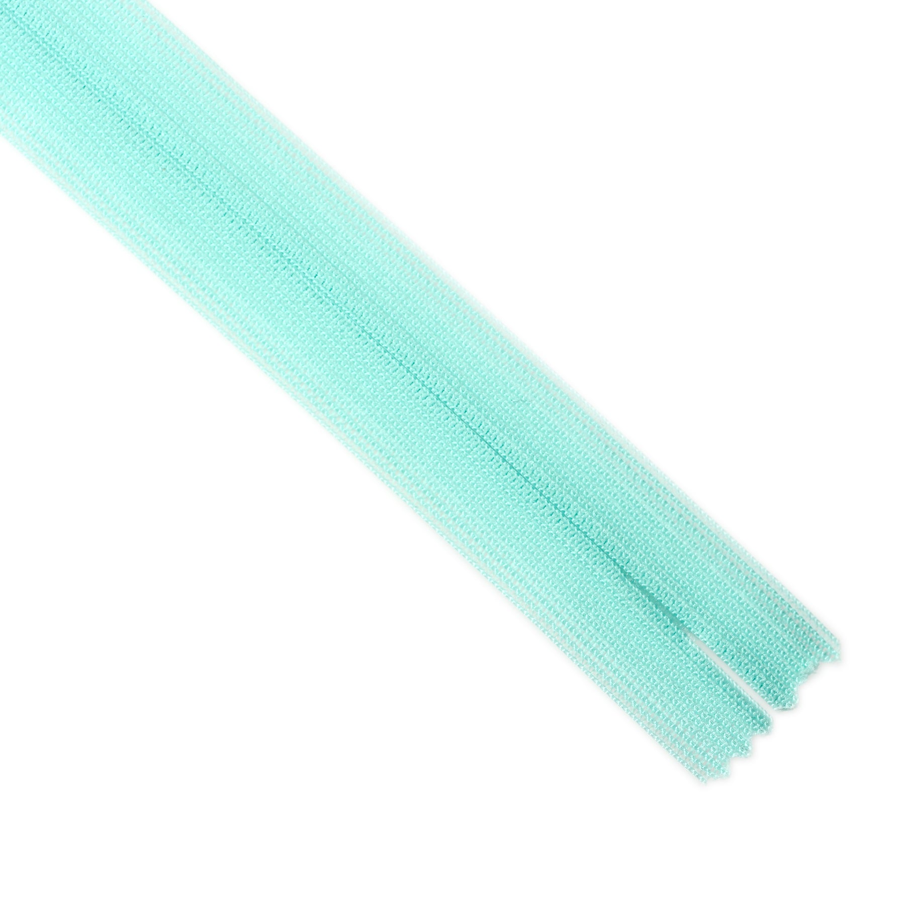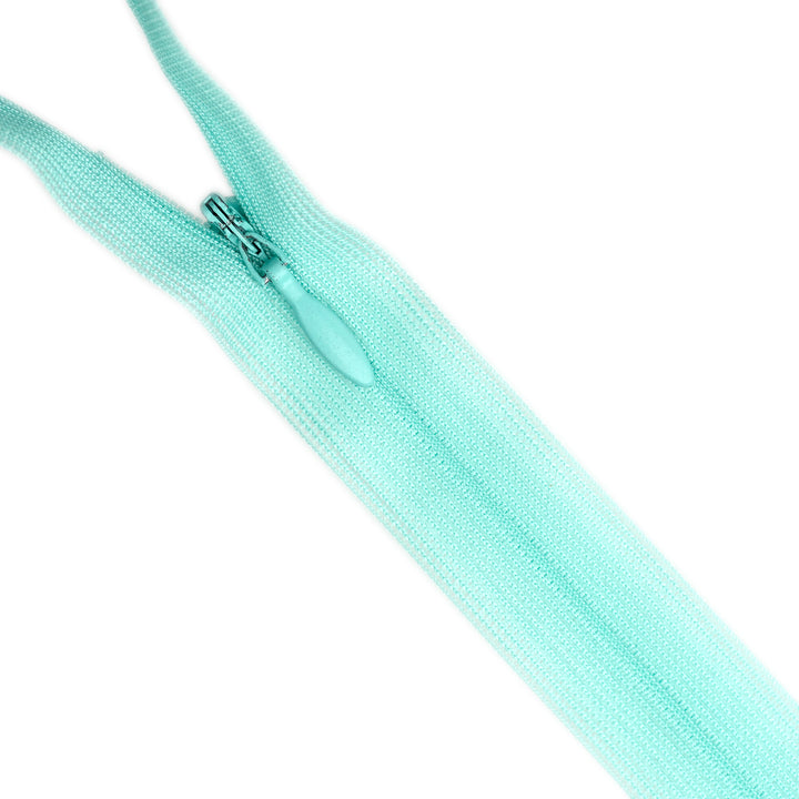 Invisible zip manufactured by YKK with lightweight mesh tape suitable for skirts, dresses, pants, soft furnishings and other applications where an unobtrusive zip is required. Discreet zip that fits into the seam with only the slim, elongated teardrop slider visible.
