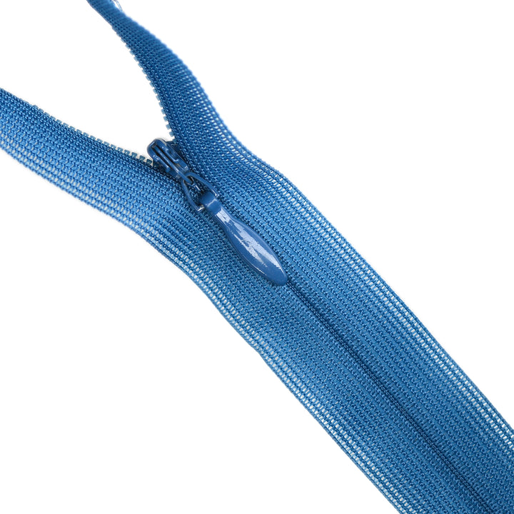 Invisible zip with lightweight mesh tape suitable for skirts, dresses, pants, soft furnishings and other applications where an unobtrusive zip is required. Discreet zip that fits into the seam with only the slim, elongated teardrop slider visible.