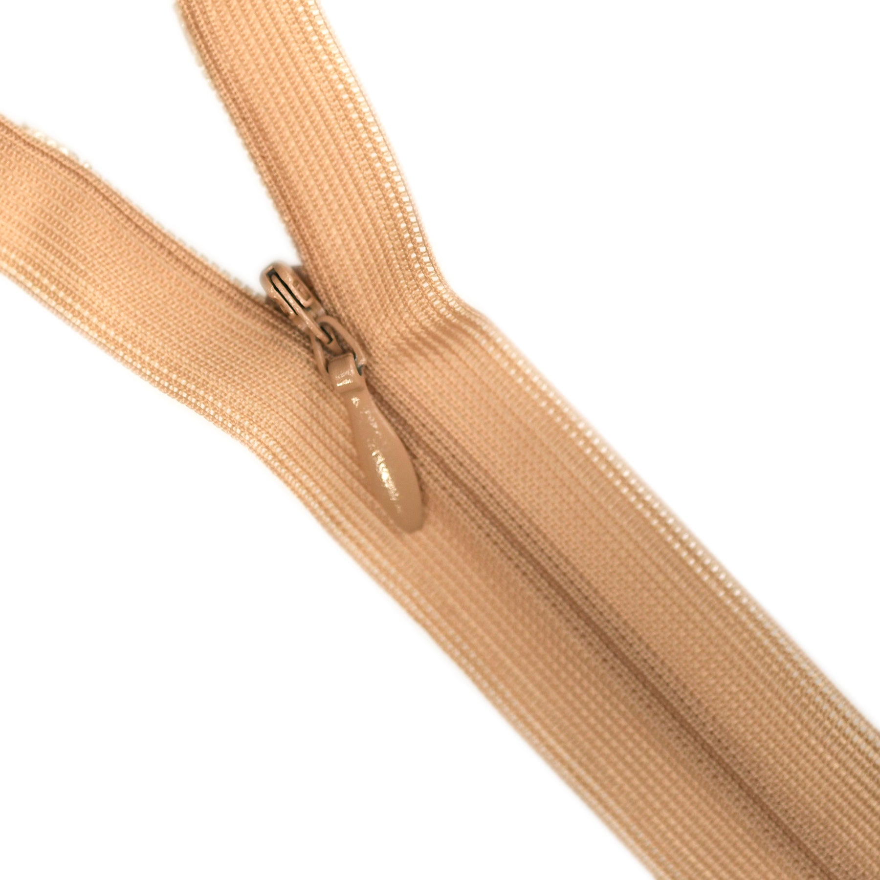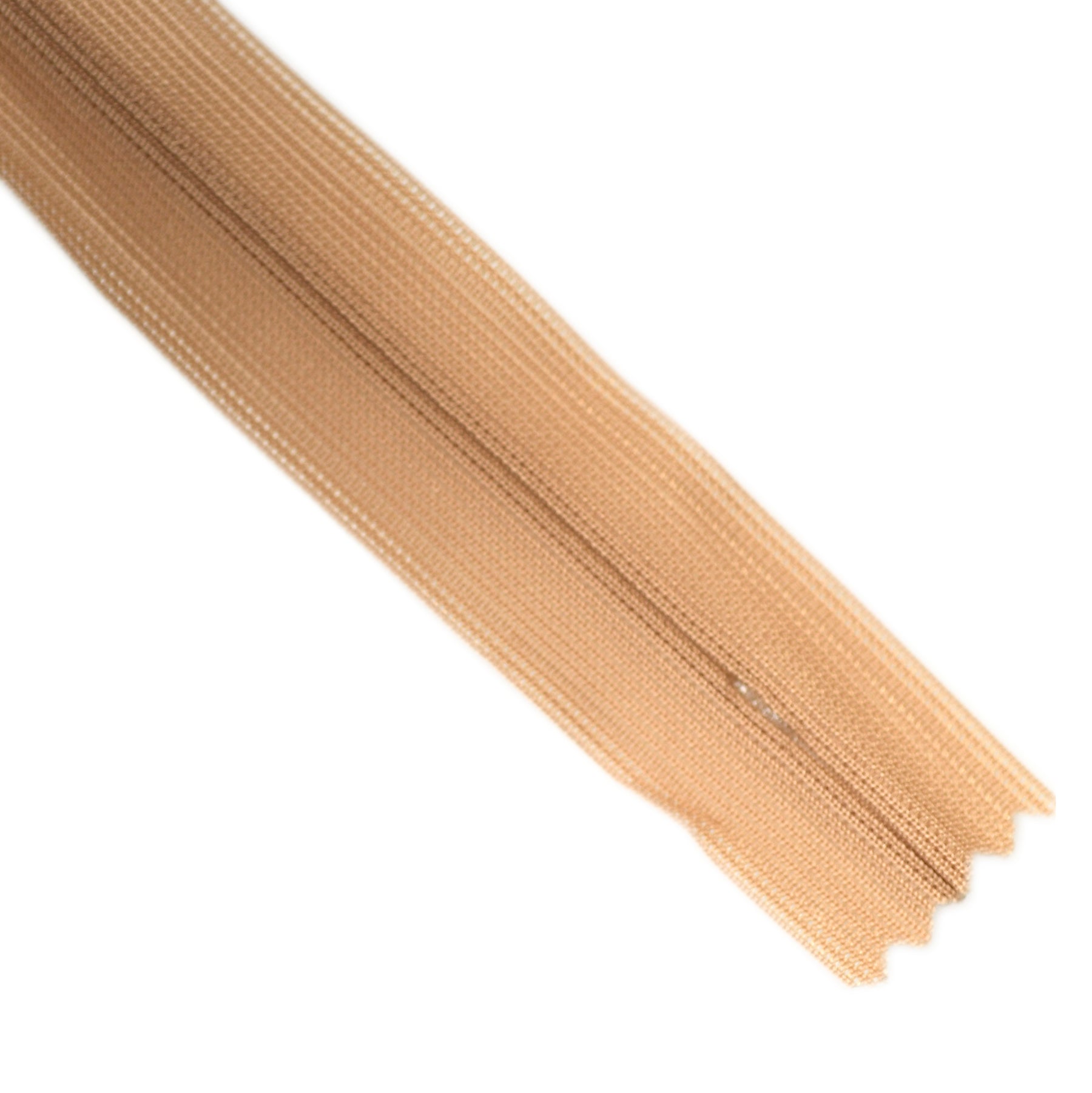 Invisible zip with lightweight mesh tape suitable for skirts, dresses, pants, soft furnishings and other applications where an unobtrusive zip is required. Discreet zip that fits into the seam with only the slim, elongated teardrop slider visible.