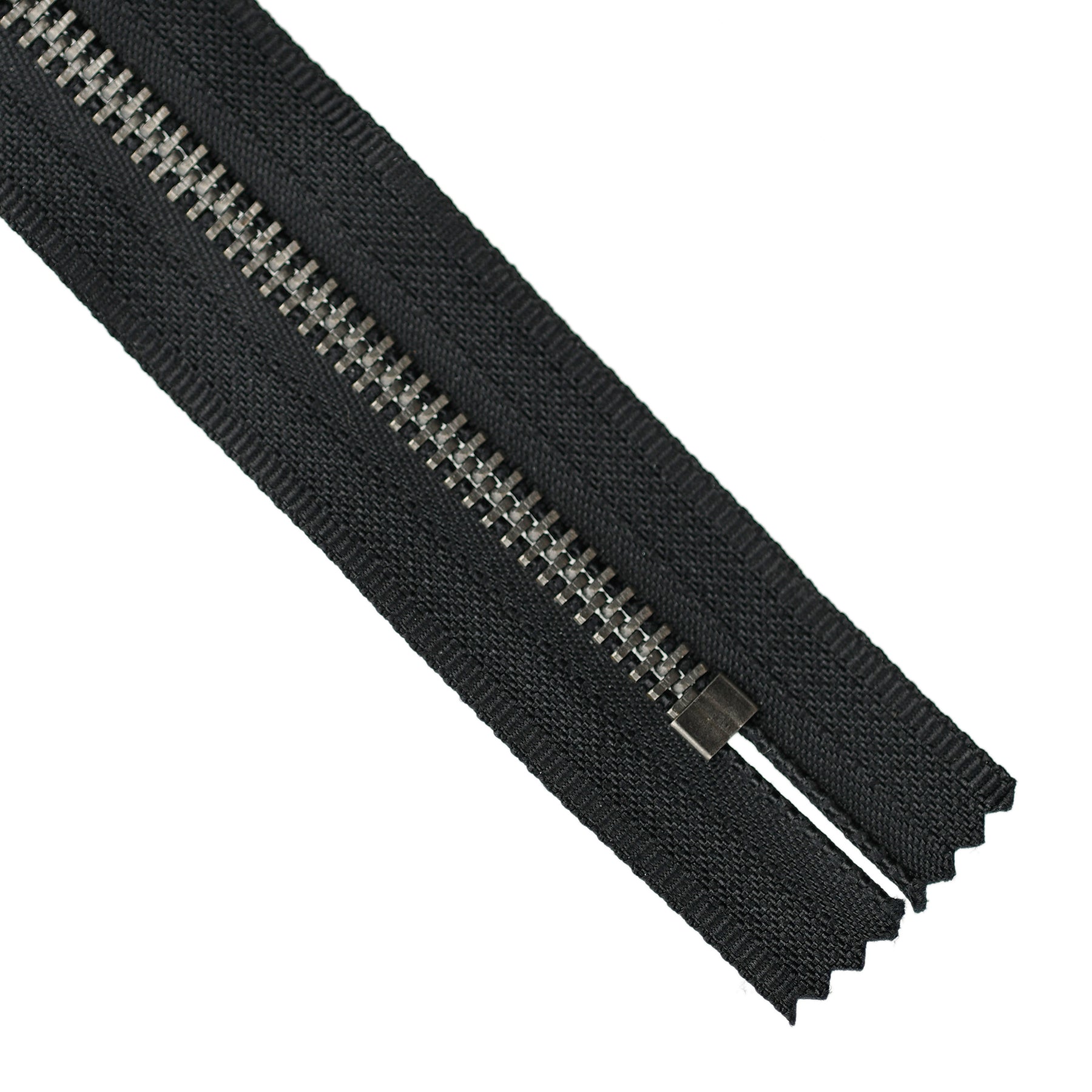 Medium gauge, closed-end zip with antique nickel elements and standard matching slider. Suitable for workwear, dresses/skirts, luggage and bags.