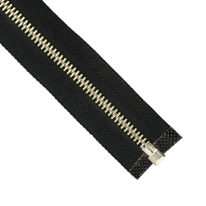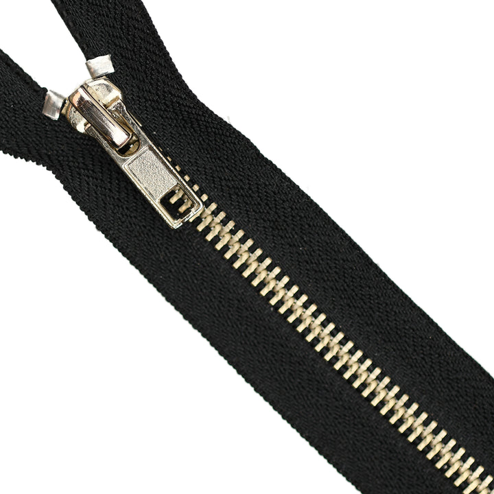 Medium gauge, open-end No.5 metal zip with nickel elements. Suitable for jackets and garments.