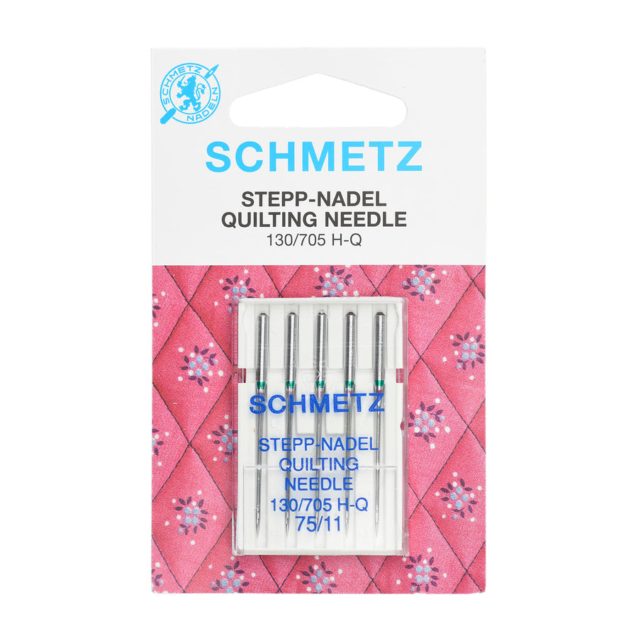 Schmetz quilting needle for domestic sewing machines. Designed for machine quilting and topstitching, the needle is specifically designed for piecing and quilting. Features a taper to the slightly rounded point to enable the needle to easily penetrate the fabric and minimise skipped stitches.