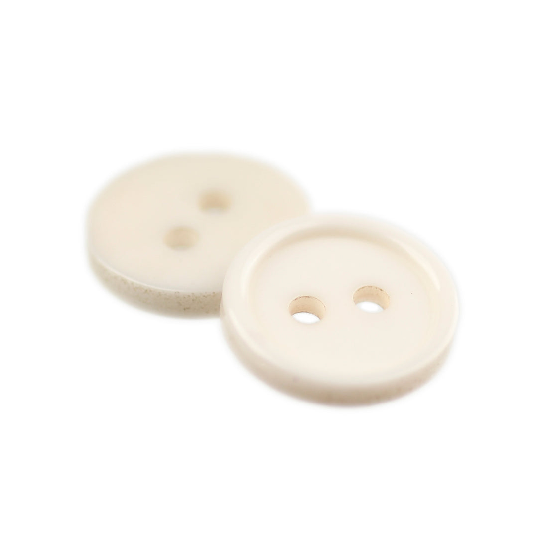 Two-hole button with narrow rim on front face and flat back. Finished in gloss.