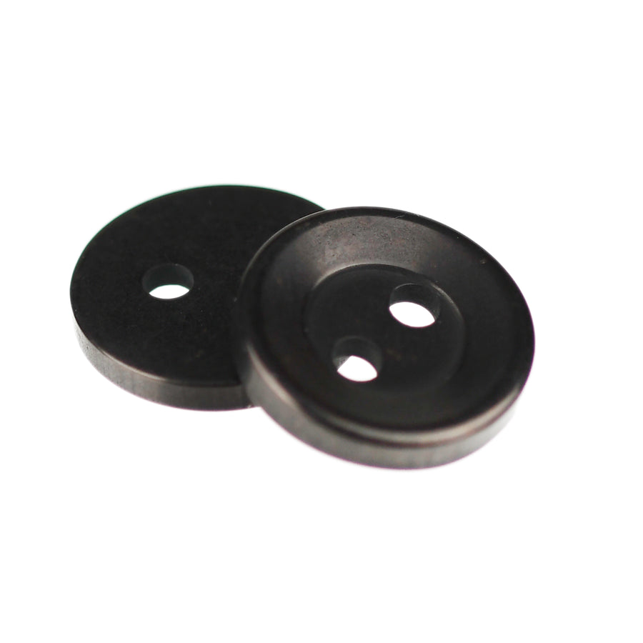 Two-hole button with wide bevel rim around front edge. Suitable for tailoring applications including shirts, cuffs and collars.