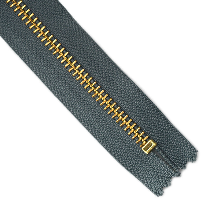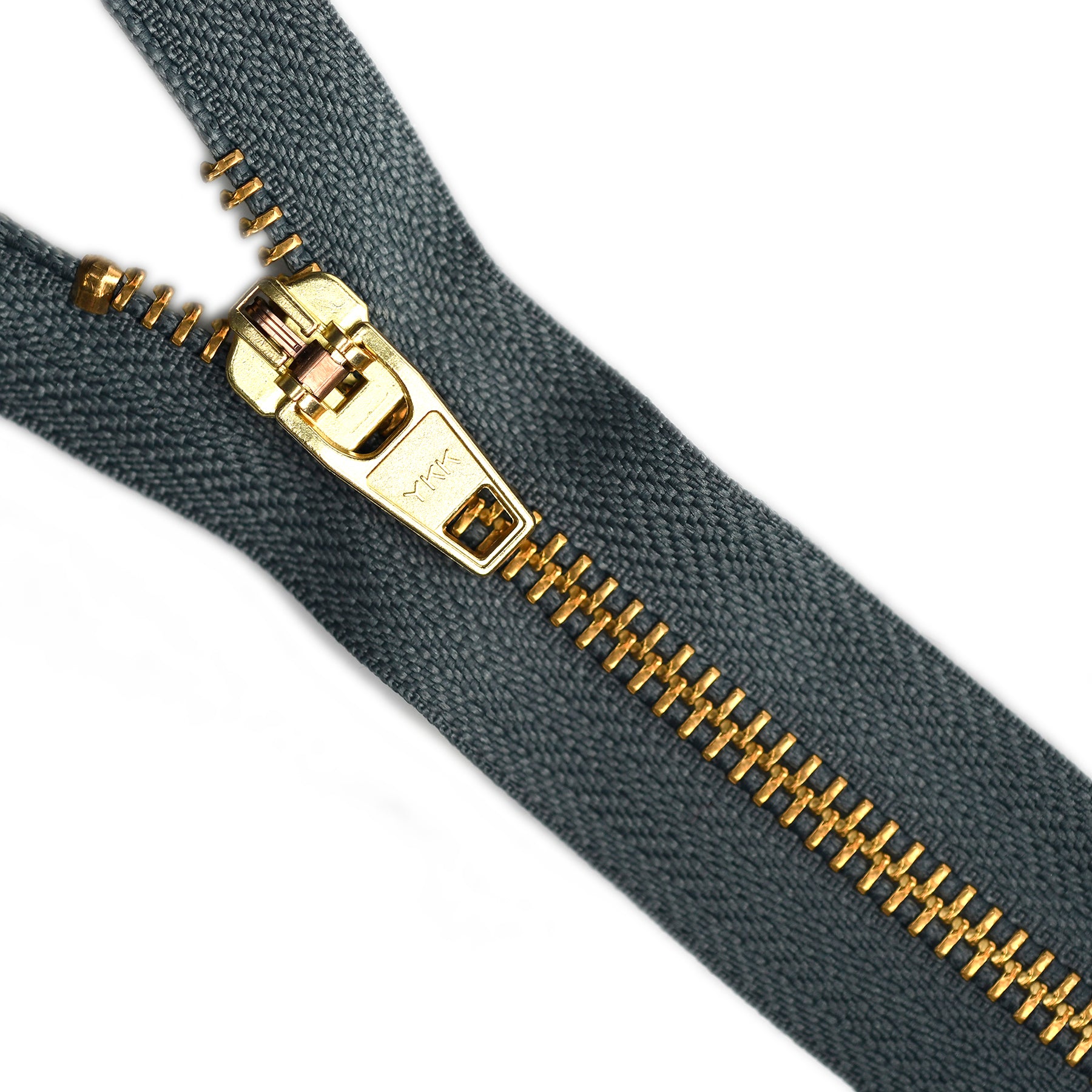 Medium gauge YKK jean zip designed specifically for use on denim jeans and jackets with elements in gold. High impact gold elements offers a visual accent to any application. Hard-wearing jean zips that are suited to workwear, outdoor-wear, and heavy-duty fabrics.