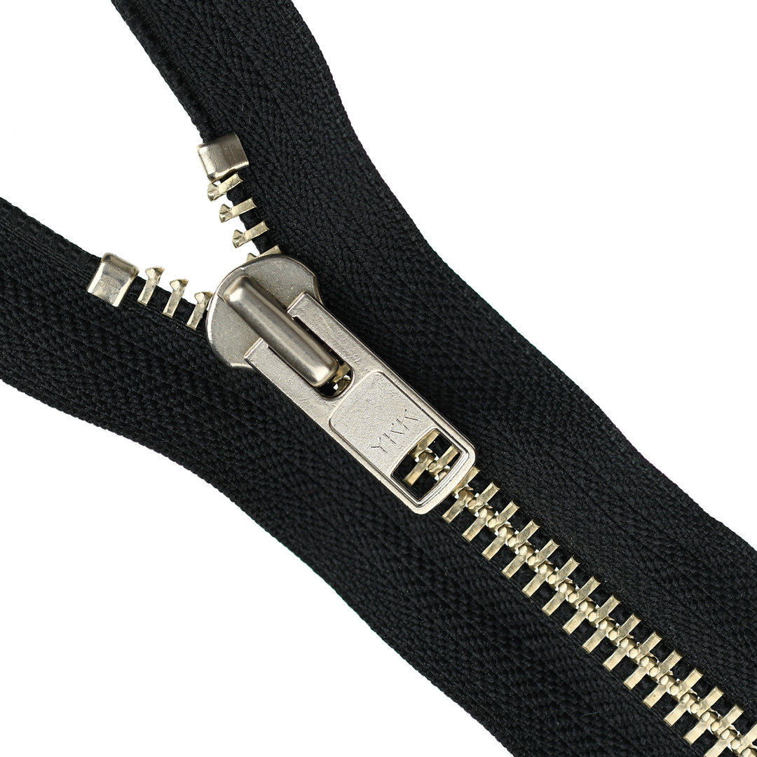 Extra-large metal zipper with nickel elements and a standard proportional slider. Heavy-duty zip suited to bags and outdoor-wear. Quality YKK woven tape makes this is a hardworking zip and the large elements provide a statement closure.