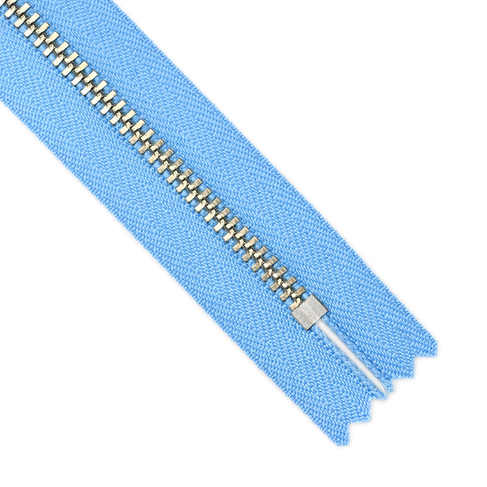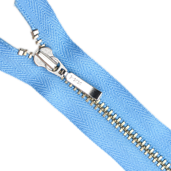 YKK light gauge, closed-end metal zips in nickel finish and featuring the distinctive board-pull slider. Suitable for applications including garments, footwear, luggage and bags.