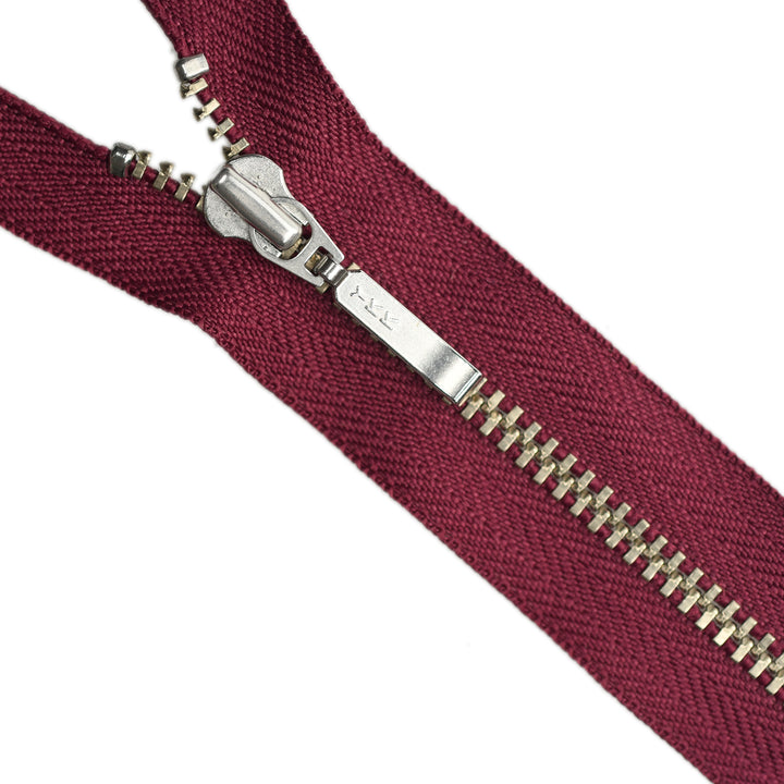 YKK light gauge, closed-end metal zips in nickel finish and featuring the distinctive board-pull slider. Suitable for applications including garments, footwear, luggage and bags.