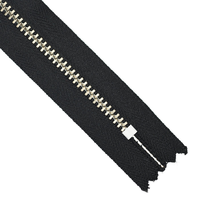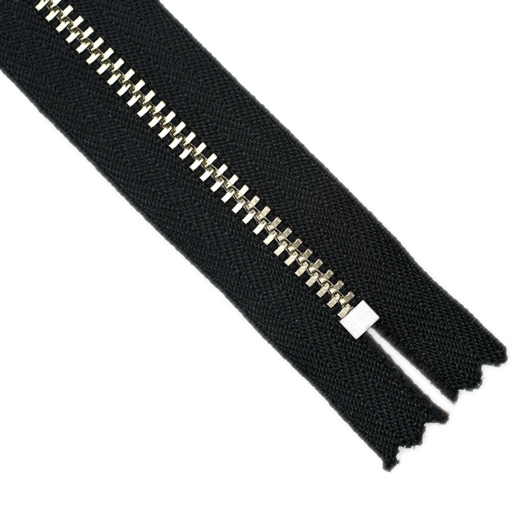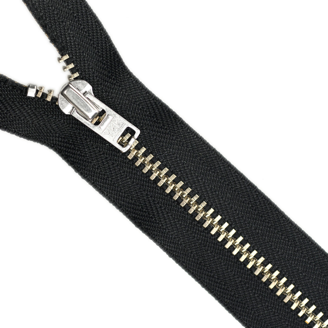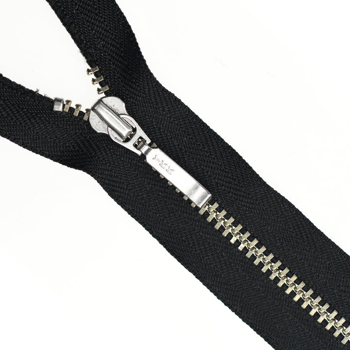 YKK light gauge, closed-end metal zips in nickel finish and featuring the distinctive board-pull slider. Suitable for applications including garments, footwear, luggage and bags.