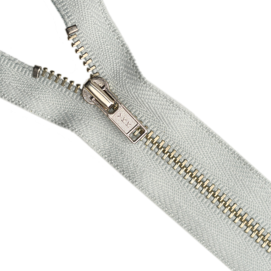 YKK light gauge, closed-end metal zips in nickel finish. Suitable for applications including garments, footwear, luggage and bags.