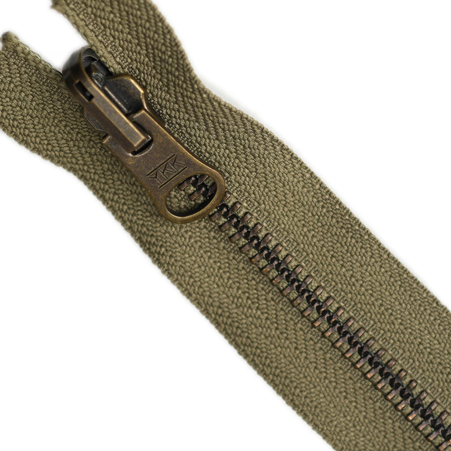 YKK medium gauge, closed-end zip with Antique Gold elements and a moveable, reversible slider. Suitable for closures, luggage and bags.