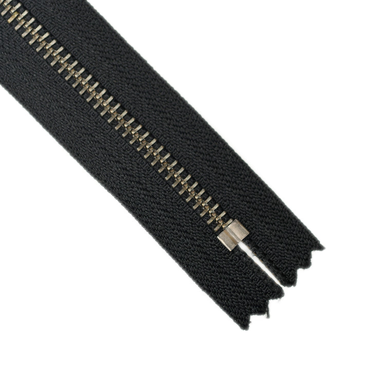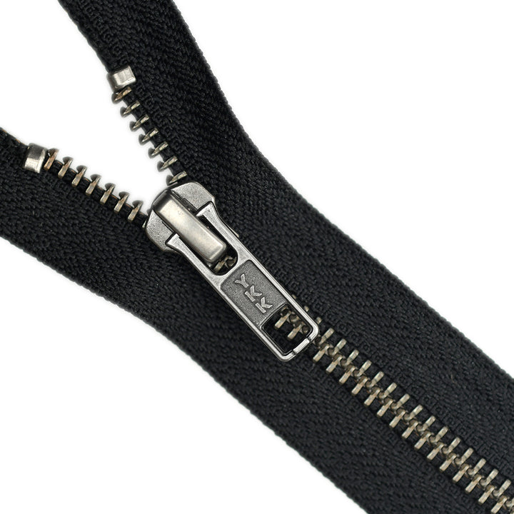 YKK medium gauge, closed-end zip with Antique Nickel elements. Suitable for workwear, dresses/skirts, luggage and bags.