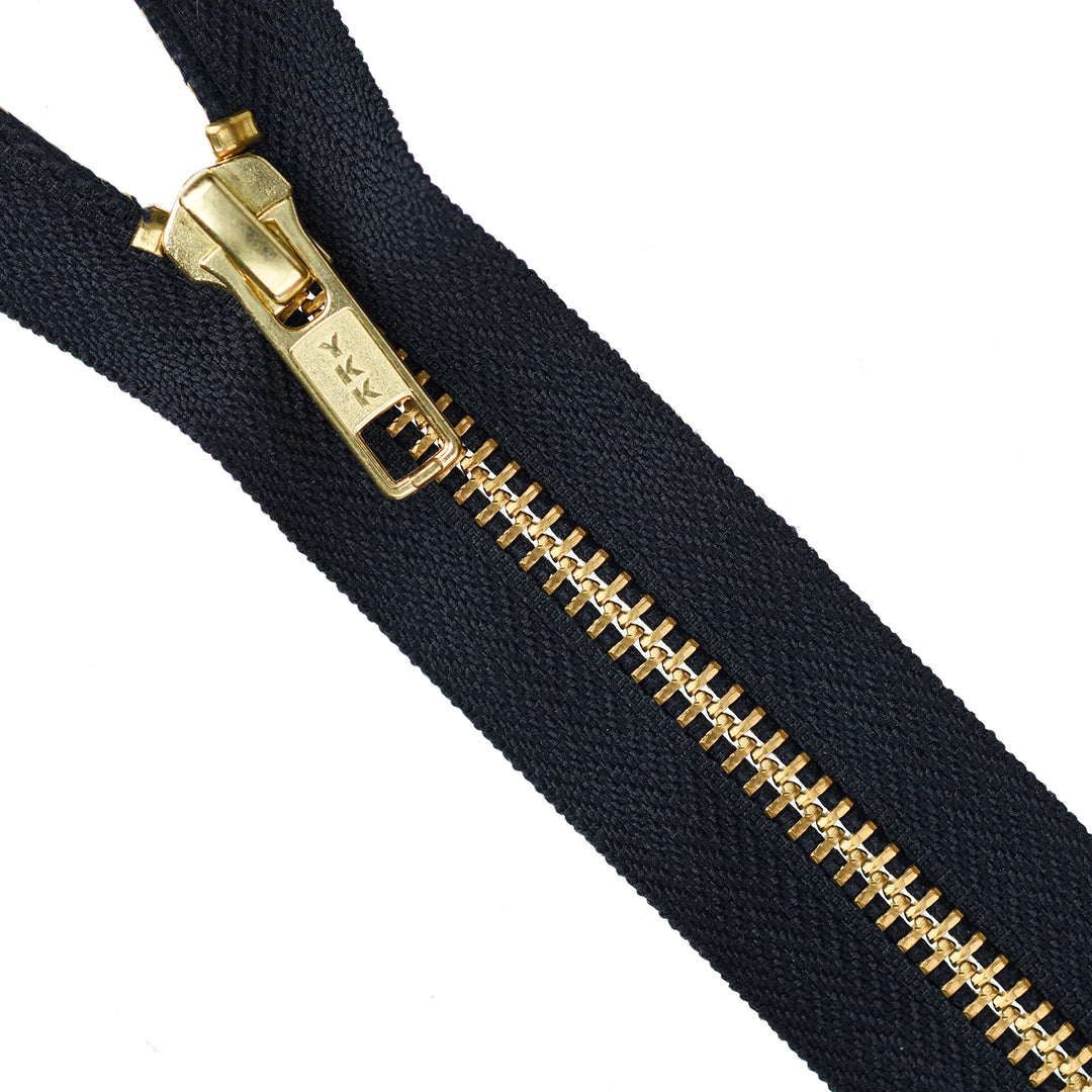 YKK medium gauge, closed-end zip with Gold elements. Suitable for workwear, dresses/skirts, luggage and bags. Versatile zips with excellent durability and colour fastness.