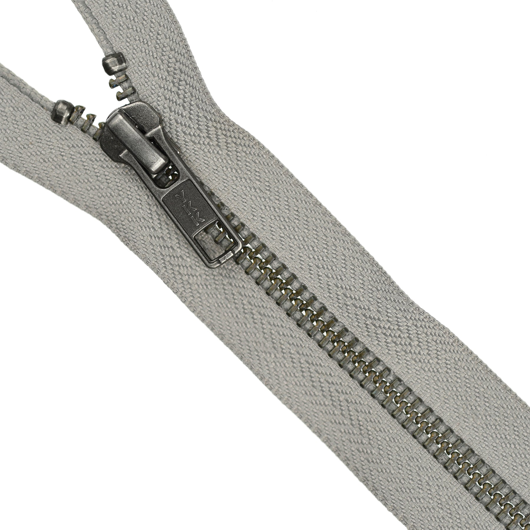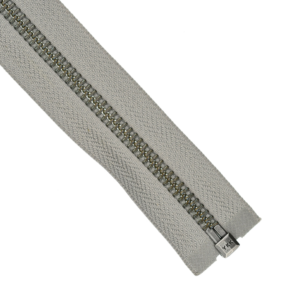 Medium gauge, open-end YKK No.5 metal zip with vintage-look Antique Nickel elements. Suitable for garments such as jackets, hoodies and knitwear. High level of abrasion resistance and smooth closure function. Images of colour and size are indicative only and may vary due to screen and device settings.