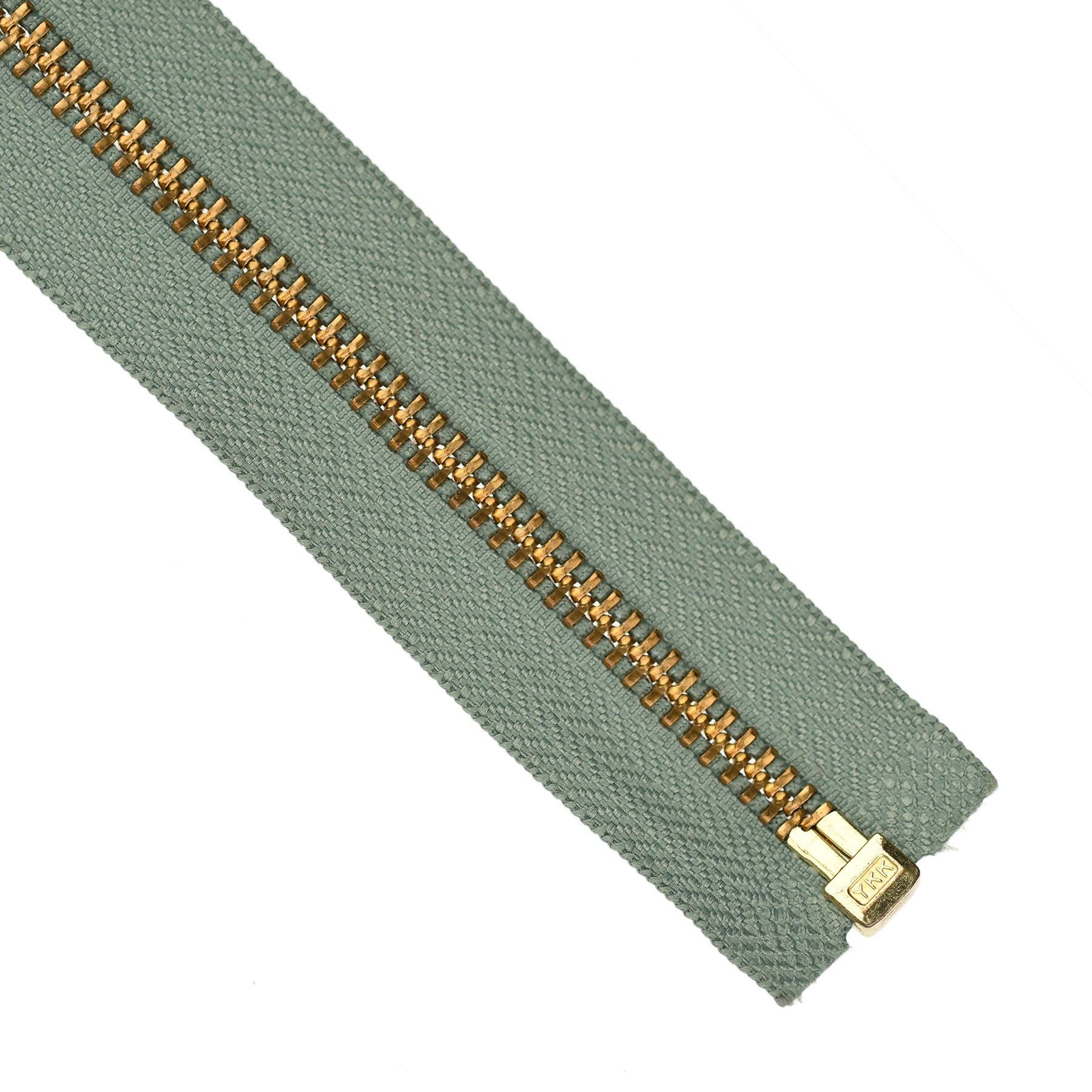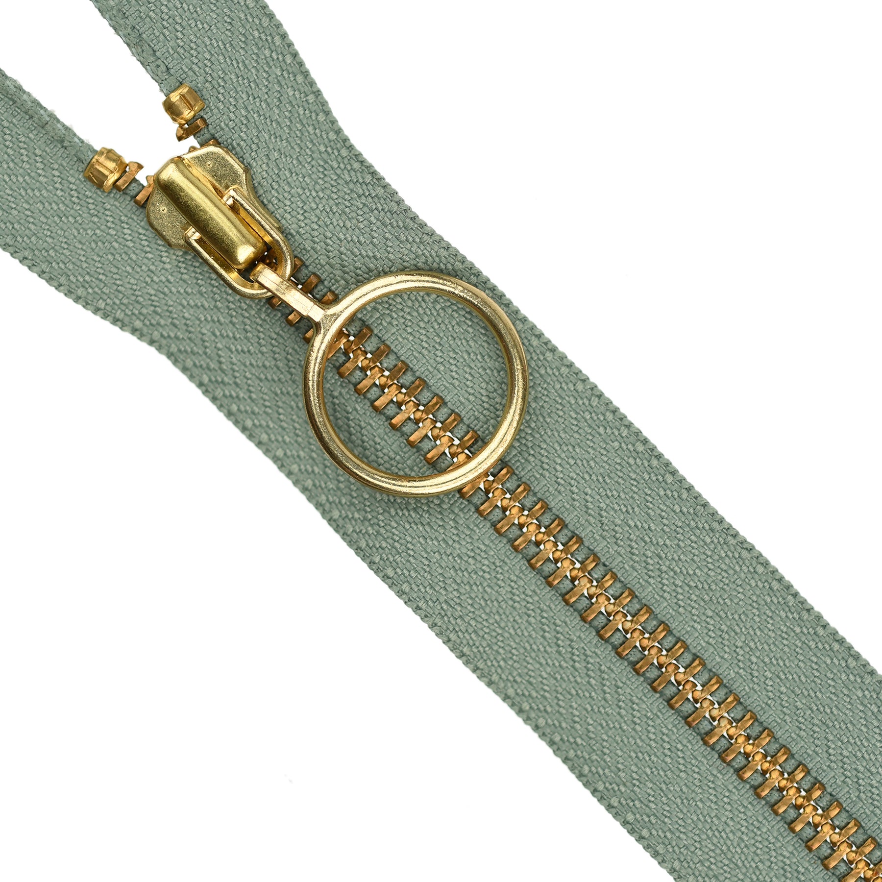 YKK medium gauge, open-end metal zip in gold finish with distinctive ring-pull slider. Suitable for applications including garments, jackets, knitwear and accessories.