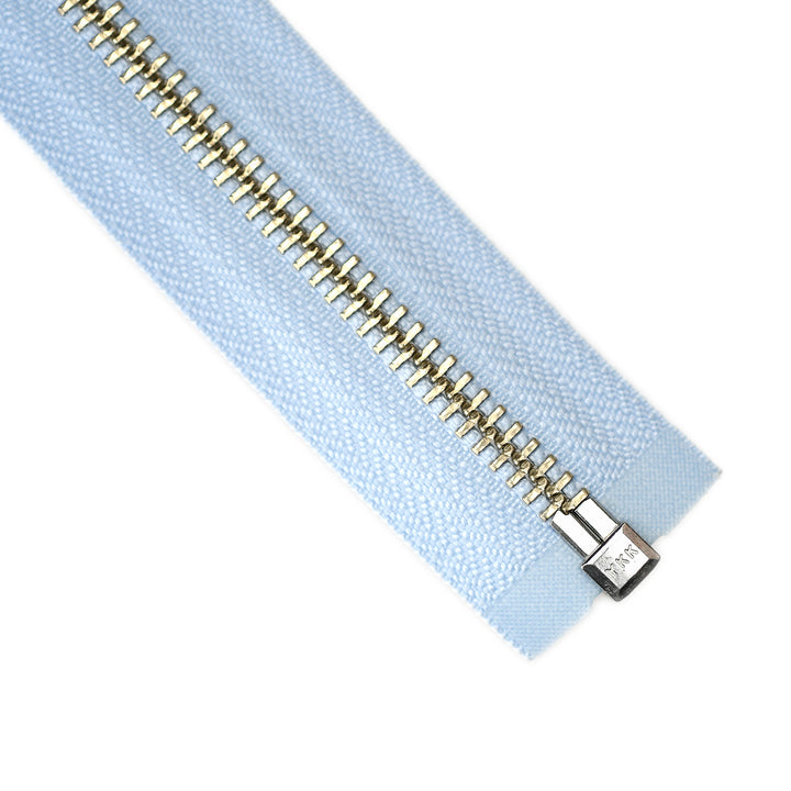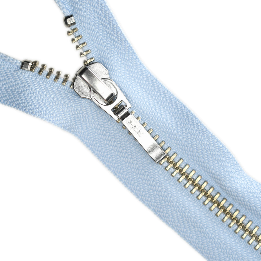 YKK medium gauge, open-end metal zips in traditional nickel finish with distinctive board-pull slider. Suitable for applications including garments, jackets, knitwear and accessories.