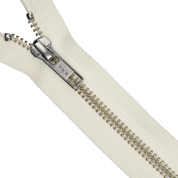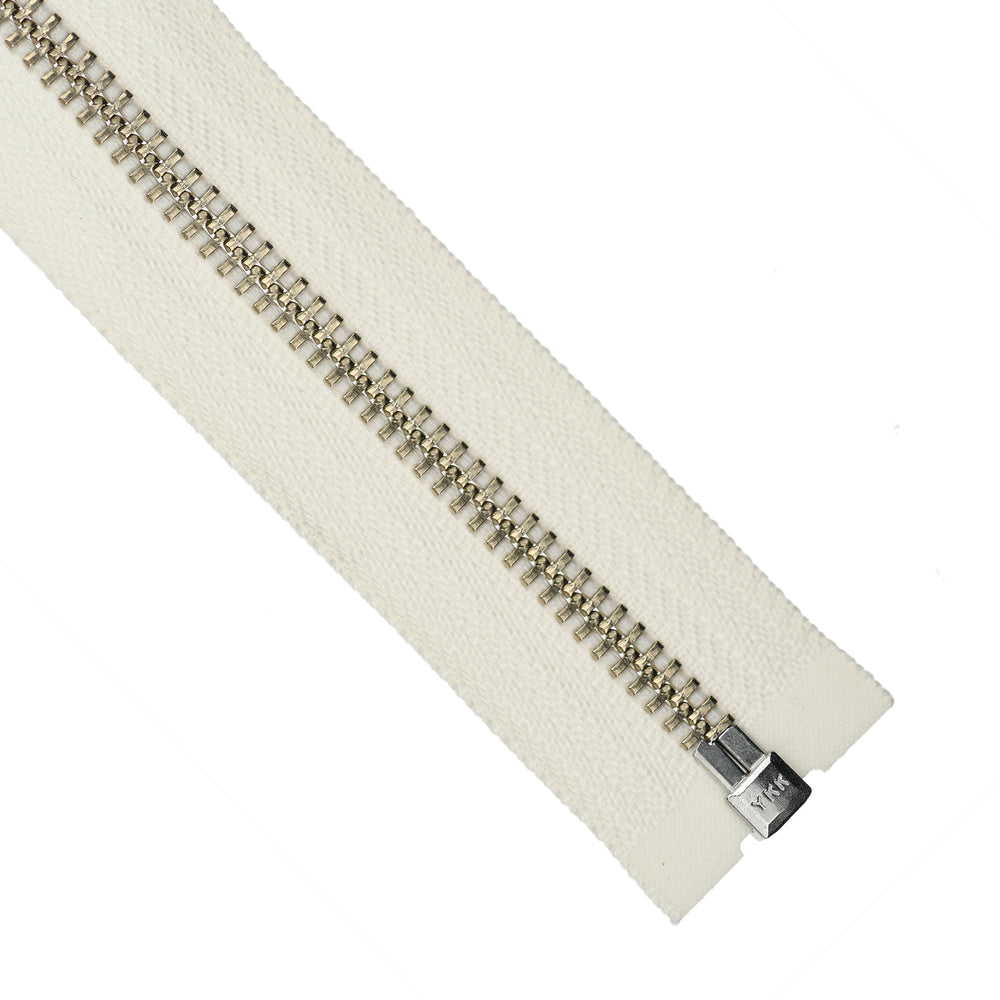 YKK medium gauge, open-end metal zips in nickel finish. Suitable for applications including garments, jackets, knitwear and accessories.