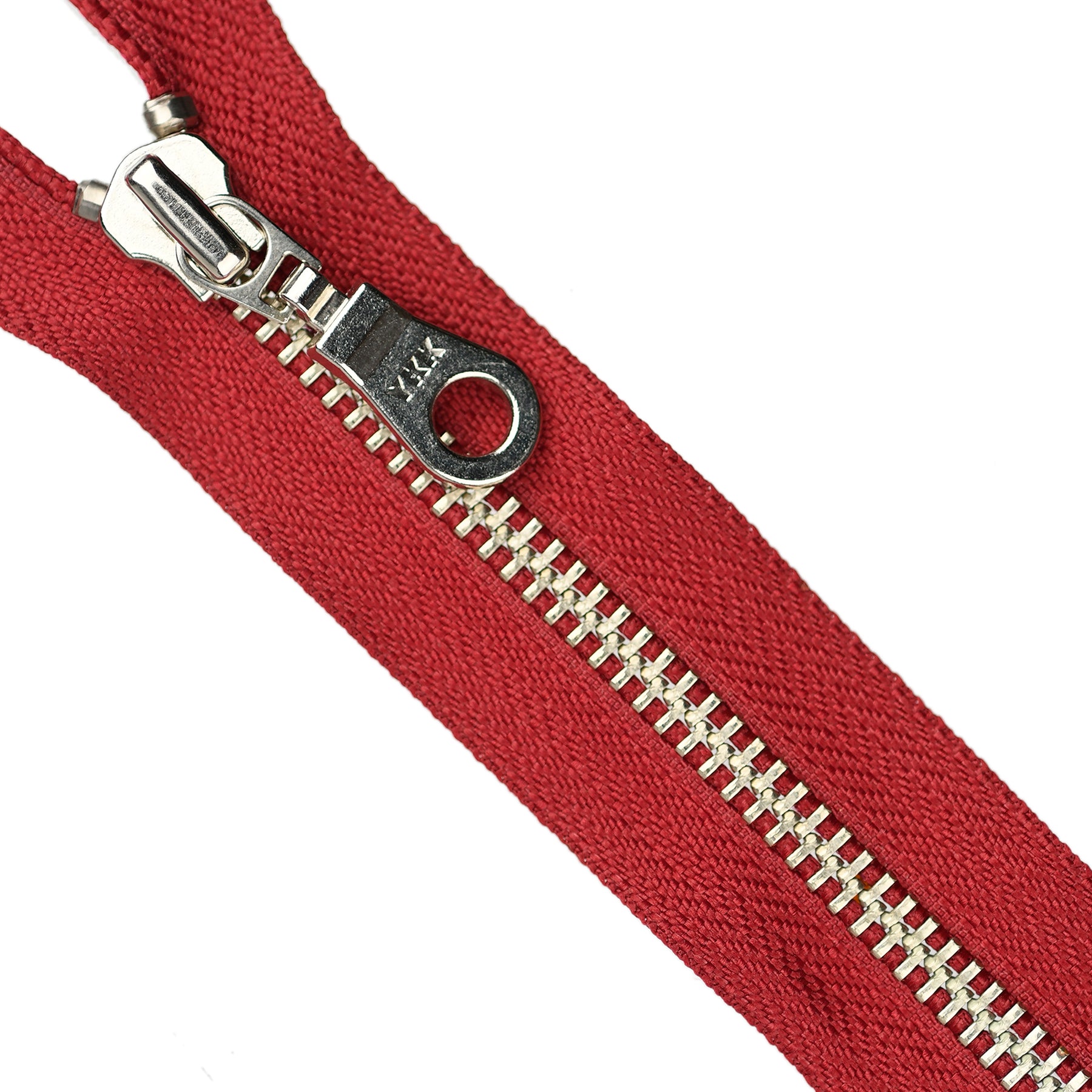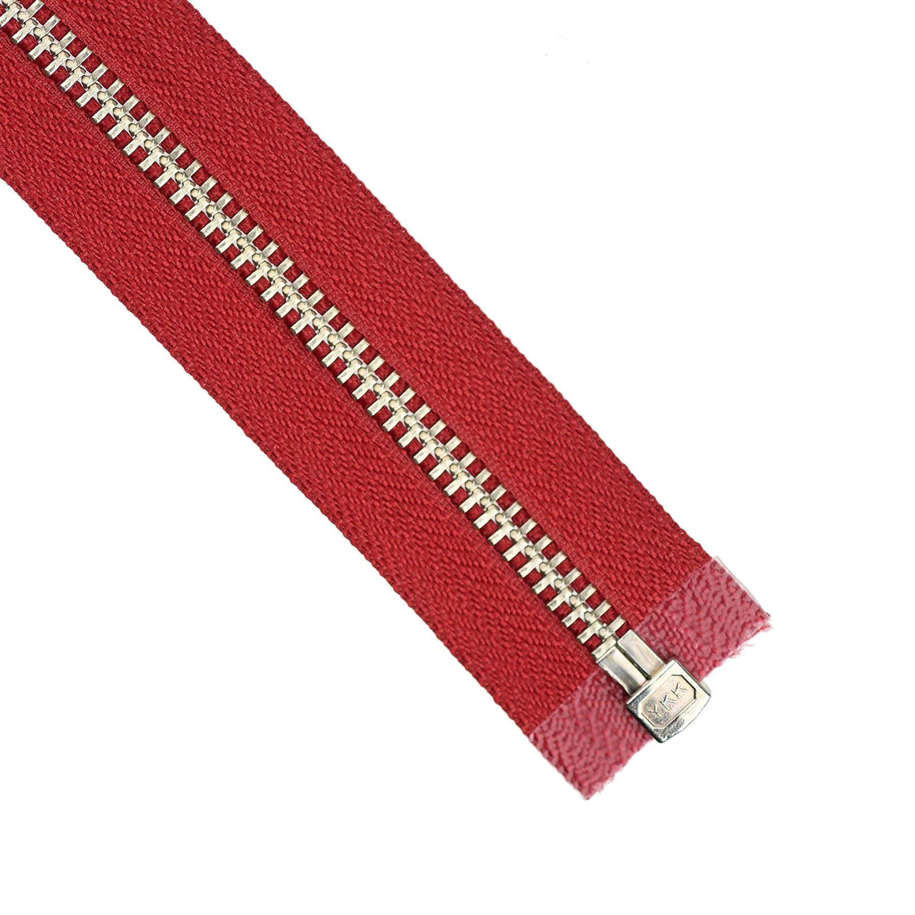 YKK medium gauge, open-end metal zips in traditional nickel finish and featuring a donut-drop slider with YKK branding. Suitable for applications including garments, jackets, knitwear and accessories.